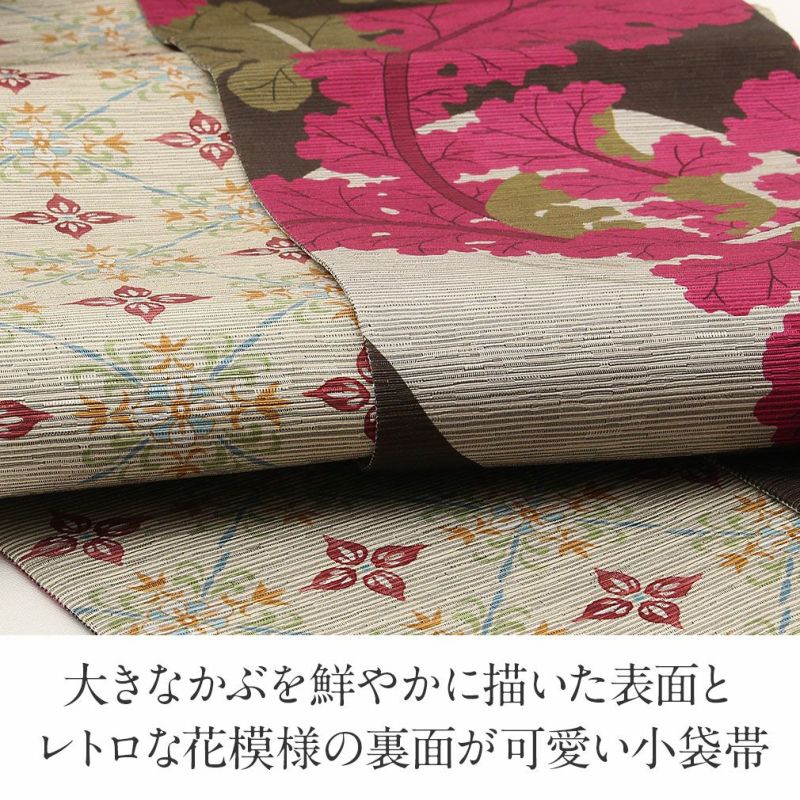 かわいらしく一点ごとに個性がキラリと光る召しませ花の半巾帯です。 お洒落な柄が着姿を華やかに彩る、リバーシブル小袋帯は、 裏側をちらりと見せてワンポイントにしてみたり、リボン結びで裏と表両方見せてみたり、 色々な結び方で着物姿を粋に演出することができます。 表面は、茶色地にカラフルな大きなかぶと、それを引っ張るネズミの絵柄が、可愛らしくお洒落な雰囲気。 裏面は、ベージュ地にアンティークな花模様がレトロで上品なデザイン。 絹とポリエステルを合わせて織り合わせており、しなやかな手触りと締め心地の良い逸品です。 丁寧に仕上げられた信頼のある日本製の帯は、仕立て上がりですので、お届け後すぐにお召しいただけます。 小紋や紬などの普段のお着物にあわせてみたり、注目を集めること間違いなしの1本です。 自由な帯結びで個性的なコーディネートがお楽しみいただけます。