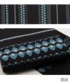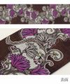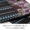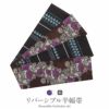 かわいらしく、一点ごとに個性がキラリと光る「召しませ花」のリバーシブル半幅帯です。 表面は、落ち着いた茶色に鮮やかな紫の花が映える、エレガントな動きのある更紗柄のデザイン。 裏面は、シックな黒地に青系で北欧の紋章を思わせるようなシンプルで上品な模様です。 両面どちらもおしゃれな柄で着姿を華やかに彩るリバーシブル小袋帯は、 裏側をちらりと見せてワンポイントにしてみたり、リボン結びで裏と表両方見せてみたり、 色々な結び方で着物姿を楽しく演出することができます。 柔らかな絹の生地をデジタル捺染プリントで柄付け。 織の帯では実現できないような細かく複雑な模様や繊細な色彩感も楽しんでいただけるのが特長です。 絹への染色は化繊や綿生地よりも色の出方も深みがあって高級さを感じられます。 柔らかな絹を質感を生かすため、とろみを感じられるような最も柔らかい帯芯を採用。 はんなりとした帯結びも楽しんでいただけます。 十分な長さがあり、リバーシブルで両面がおしゃれなので、出す柄や結び方によっても様々な表情を演出してくれます。 貝ノ口やかるた結びなどの小粋でスマートな帯結びから、三重仮紐を使ったボリュームのある変わり結びまで楽しめるのが半幅帯の魅力です。 1本増えるだけで着物コーディネートの楽しみがグッと広がる半幅帯、ぜひワードローブに加えてみてはいかがでしょうか。