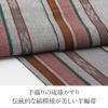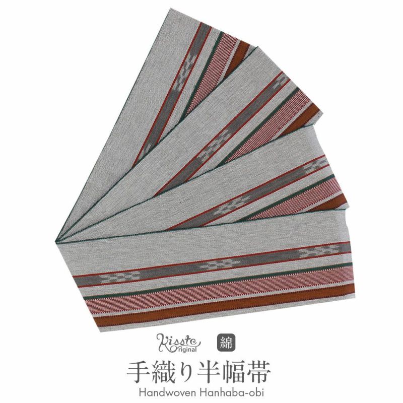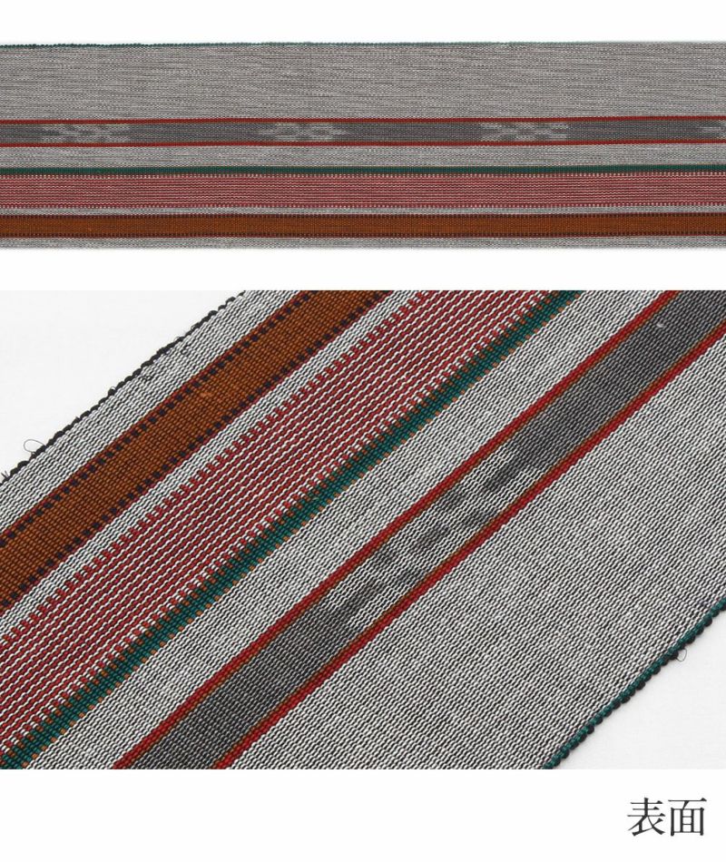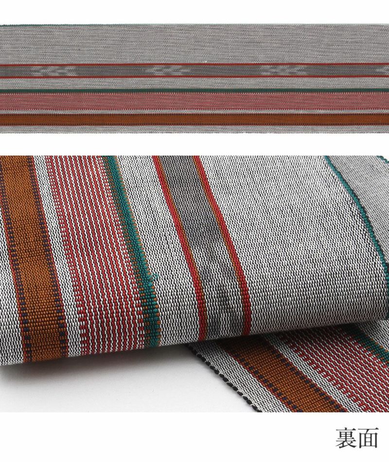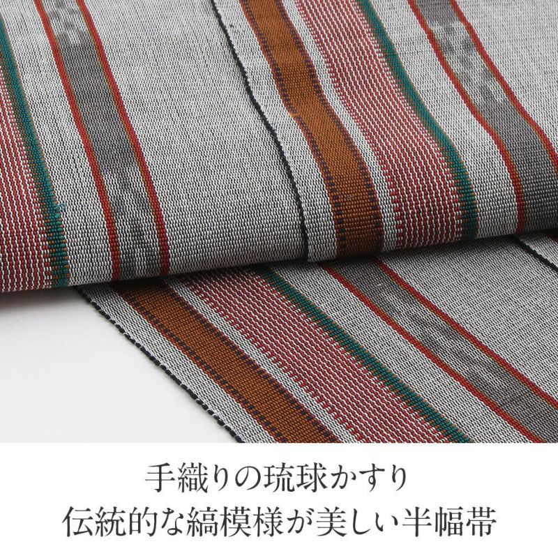 琉球王朝時代から南風原町を主産地として伝わる琉球かすりの半幅帯です。 絵絣の柄や、色の配色に特徴があり、手織りの風合いも強く感じられる温かみのある商品です。 しっかりとした綿糸で打ち込みが良く織られており、張りのある仕上がりとなっております。 永い間のご使用でも型崩れしにくくお使いいただけます。 伝統的な絣や縞模様のデザインは、無地だけではなく、柄の付いたお召し物にも合わせやすく、 普段使いの気軽なコーディネートとして大変重宝致します。一年を通してお楽しみいただける帯になります。 小紋や紬などのカジュアルな装いをはじめ、浴衣や街着など気軽に締めていただきたい逸品です。