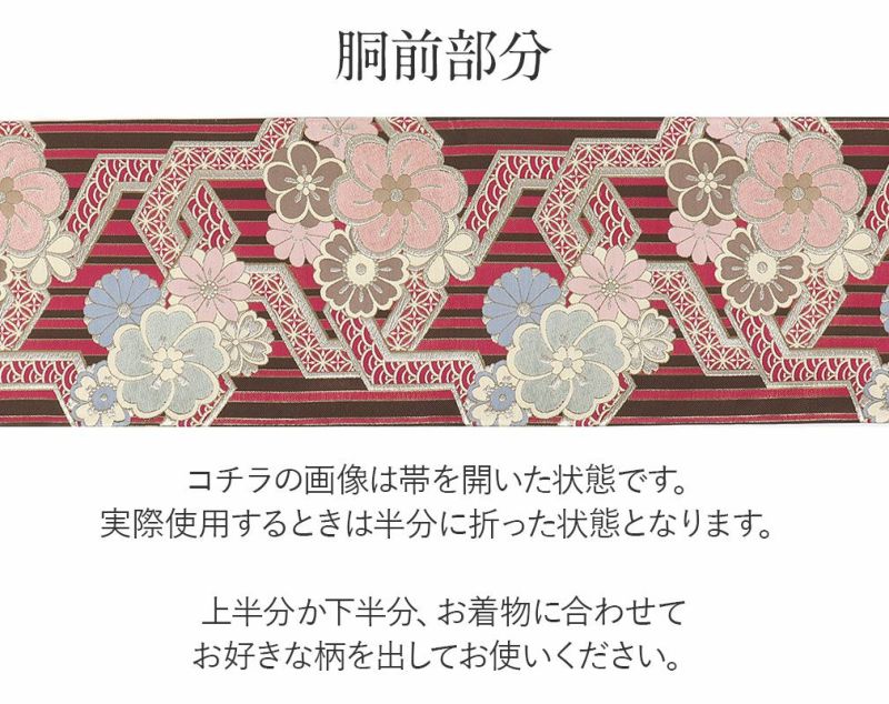 ●実際の商品と同じ色合いに画像修正をしておりますが、環境やモニターの違いにより多少色の違いが出て来ることがあります、ご了承ください。 ●生地の取り方により、柄の出方が異なる場合がございます。 ●こちらの帯はすでにお仕立てが済んでいる帯です。 ●お仕立ては【袋帯仕立て】となります。
