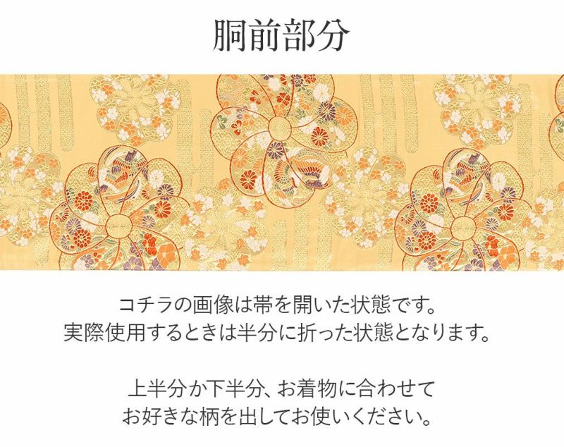 ●実際の商品と同じ色合いに画像修正をしておりますが、環境やモニターの違いにより多少色の違いが出て来ることがあります、ご了承ください。 ●生地の取り方により、柄の出方が異なる場合がございます。 ●こちらの帯はすでにお仕立てが済んでいる帯です。 ●お仕立ては【袋帯仕立て】となります。