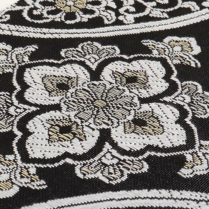 夏の結婚式の留袖や、訪問着などの礼装用にお使い頂ける、西陣織のお仕立て上がり夏袋帯です。 シックな黒地に白・シルバー・ゴールドを使って、七宝華紋が繊細に描かれた優美で上品な印象のデザインです。 帯は伝統工芸の西陣織にて仕立てられており、染められた糸を複雑に織って模様を作るので、完成までに多数の工程があり、とても手間暇がかかる高級絹織物です。 こうして丁寧に織られた生地は、先染めしてから織っているので、一般的な染色法の後染めより丈夫でシワになりにくいのが特徴です。 綿密に織られた西陣織は糸数も多く、ぐっと締まって緩みにくいので、着姿もしゃんと背筋が伸びます。 絹の帯には、金銀糸などを使用しており、魅入ってしまうほどの美しい輝きが魅力的。 光の当たり方で、絹特有の柔らかな光沢や金銀糸が反射し、高級感あふれる美しい帯がお楽しみいただけます。 どんなお色のお着物にも合わせやすく、コーディネート次第で様々なシーンへお出かけいただけます。 ご年代も選ばないので、お母さまとお嬢様で共有されても良いでしょう。 絹の質感と光沢、上品で絶佳なデザインが、大切なお祝いの席を華やかに演出します。 夏結婚式の黒留袖、色留袖を始め、訪問着など、初夏から盛夏、晩夏のフォーマルな装いにピッタリのおすすめの逸品です。