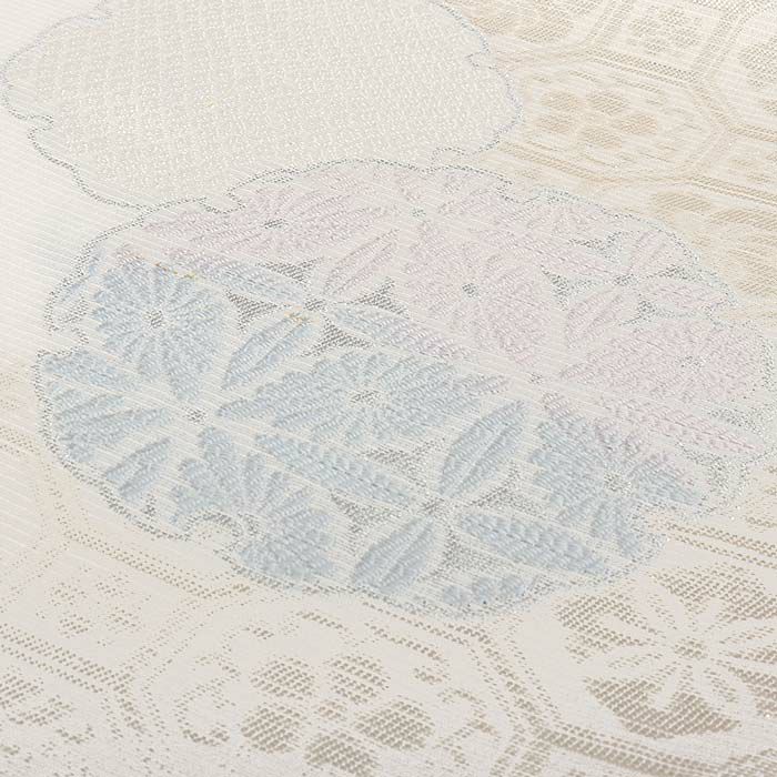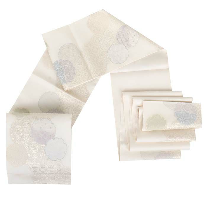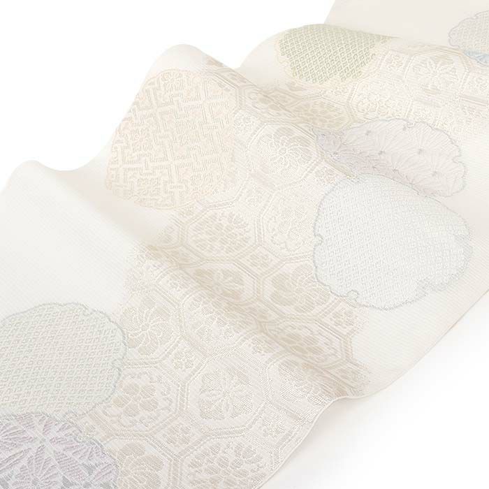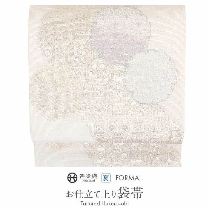 夏の結婚式の留袖や、訪問着などの礼装用にお使い頂ける、西陣織のお仕立て上がり夏袋帯です。 爽やかな白の帯地に、煌めくシルバーや薄紫・水色・薄緑などの淡色で雪輪・蜀江華紋が描かれた、上品でお洒落な印象のデザインです。 帯は伝統工芸の西陣織にて仕立てられており、染められた糸を複雑に織って模様を作るので、完成までに多数の工程があり、とても手間暇がかかる高級絹織物です。 こうして丁寧に織られた生地は、先染めしてから織っているので、一般的な染色法の後染めより丈夫でシワになりにくいのが特徴です。 綿密に織られた西陣織は糸数も多く、ぐっと締まって緩みにくいので、着姿もしゃんと背筋が伸びます。 絹の帯には、銀糸などを使用しており、魅入ってしまうほどの美しい輝きが魅力的。 光の当たり方で、絹特有の柔らかな光沢や銀糸が反射し、高級感あふれる美しい帯がお楽しみいただけます。 絹の質感と光沢、上品で絶佳なデザインが、大切なお祝いの席を華やかに演出します。 夏結婚式の黒留袖、色留袖を始め、訪問着など、初夏から盛夏、晩夏のフォーマルな装いにピッタリのおすすめの逸品です。