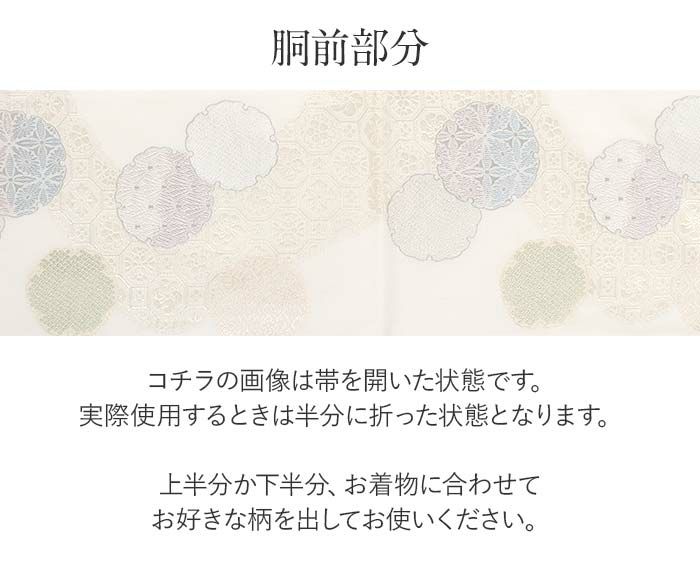 ※実際の商品と同じ色合いに画像修正をしておりますが、環境やモニターの違いにより多少色の違いが出て来ることがあります、ご了承ください。 ※こちらの帯はすでにお仕立てが済んでいる帯です。 ※お仕立ては『袋帯仕立て』となります。