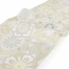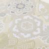 成人式や結婚式、振袖にお使いいただける、西陣織お仕立て上り袋帯です。 シャンパンゴールドの気品ある地色に、七宝や華紋が繊細に織り出され、金銀糸の輝きが晴れの日の装いを優美に彩ります。 煌びやかな光沢が上品に映え、華やかさの中に落ち着きを感じさせる一本です。 王道のスタイルからレトロ、モダンスタイルまで合わせやすく、様々なコーディネートがお楽しみいただけます。 帯は伝統工芸の西陣織にて仕立てられており、染められた糸を複雑に織って模様を作るので、完成までに多数の工程があり、とても手間暇がかかる高級絹織物です。 こうして丁寧に織られた生地は、先染めしてから織っているので、一般的な染色法の後染めより丈夫でシワになりにくいのが特徴です。 綿密に織られた西陣織は糸数も多く、ぐっと締まって緩みにくいので、着姿もしゃんと背筋が伸びます。 絹の帯には、金銀糸をふんだんに使用しており、魅入ってしまうほどの美しい輝きが魅力的。 光の当たり方で、絹特有の柔らかな光沢や金銀糸が反射し、高級感あふれる美しい帯がお楽しみいただけます。 絹の質感と光沢、大胆で鮮麗な柄が、大切なお祝いの席を華やかに演出してくれるでしょう。 成人式や結婚式、格式ある席にふさわしい、洗練の西陣織袋帯です。
