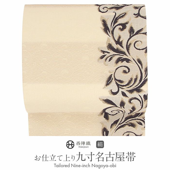届いてすぐに使える、お仕立て上がりの九寸名古屋帯です。 京都西陣で織り上げられた、西陣証紙のついた確かな品質。 上品な帯ですのでコーディネートしやすく、 小紋や紬、色無地、御召などの着物に最適です。 帯は伝統工芸の西陣織にて仕立てられており、染められた糸を複雑に織って模様を作るので、完成までに多数の工程があり、とても手間暇がかかる高級絹織物です。 こうして丁寧に織られた生地は、先染めしてから織っているので、一般的な染色法の後染めより丈夫でシワになりにくいのが特徴です。 絹の帯は光の当たり方で絹特有の柔らかな光沢が反射し、高級感あふれる美しい帯の質感がお楽しみいただけます。 しなやかな手触りと締め心地の良さを兼ね備え、正絹特有の柔らかな光沢をもつ逸品です。 仕立てはお太鼓結びのしやすい名古屋仕立て。胴前がすでに半分に折られた状態ですので、帯結びが苦手な方でも締めやすく、お稽古事にも最適な帯です。 西陣織の意匠こもった深みのある柄行きが、後ろ姿のお太鼓も胴前も凛とした着姿を演出してくれるでしょう。 ぜひご自身の着物コーディネートに取り入れていただきたい名古屋帯です。