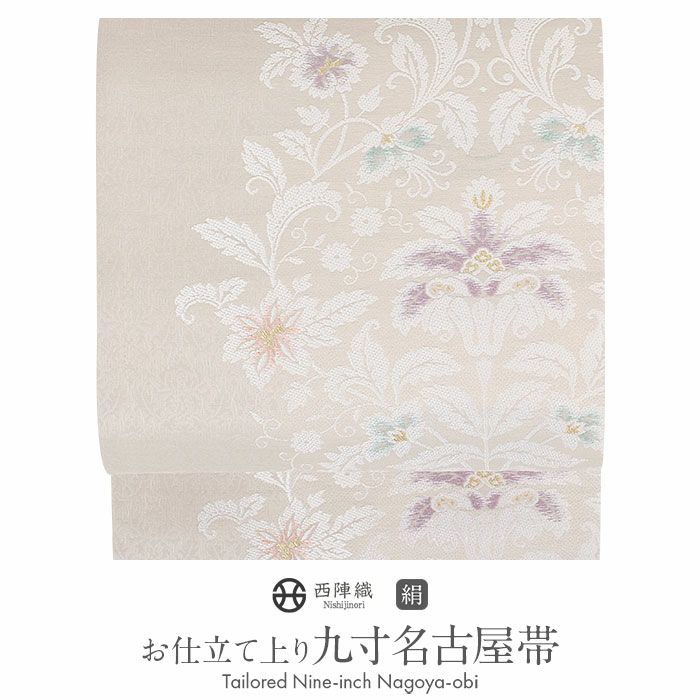 届いてすぐに使える、お仕立て上がりの九寸名古屋帯です。 京都西陣で織り上げられた、西陣証紙のついた確かな品質。 上品な帯ですのでコーディネートしやすく、 小紋や紬、色無地、御召などの着物に最適です。 帯は伝統工芸の西陣織にて仕立てられており、染められた糸を複雑に織って模様を作るので、完成までに多数の工程があり、とても手間暇がかかる高級絹織物です。 こうして丁寧に織られた生地は、先染めしてから織っているので、一般的な染色法の後染めより丈夫でシワになりにくいのが特徴です。 絹の帯は光の当たり方で絹特有の柔らかな光沢が反射し、高級感あふれる美しい帯の質感がお楽しみいただけます。 しなやかな手触りと締め心地の良さを兼ね備え、正絹特有の柔らかな光沢をもつ逸品です。 仕立てはお太鼓結びのしやすい名古屋仕立て。胴前がすでに半分に折られた状態ですので、帯結びが苦手な方でも締めやすく、お稽古事にも最適な帯です。 西陣織の意匠こもった深みのある柄行きが、後ろ姿のお太鼓も胴前も凛とした着姿を演出してくれるでしょう。 ぜひご自身の着物コーディネートに取り入れていただきたい名古屋帯です。