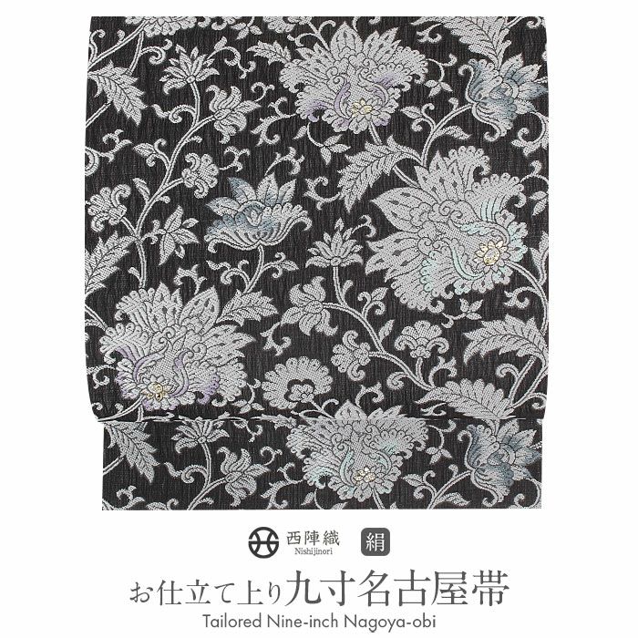 届いてすぐに使える、お仕立て上がりの九寸名古屋帯です。 京都西陣で織り上げられた、西陣証紙のついた確かな品質。 上品な帯ですのでコーディネートしやすく、 小紋や紬、色無地、御召などの着物に最適です。 帯は伝統工芸の西陣織にて仕立てられており、染められた糸を複雑に織って模様を作るので、完成までに多数の工程があり、とても手間暇がかかる高級絹織物です。 こうして丁寧に織られた生地は、先染めしてから織っているので、一般的な染色法の後染めより丈夫でシワになりにくいのが特徴です。 絹の帯は光の当たり方で絹特有の柔らかな光沢が反射し、高級感あふれる美しい帯の質感がお楽しみいただけます。 しなやかな手触りと締め心地の良さを兼ね備え、正絹特有の柔らかな光沢をもつ逸品です。 仕立てはお太鼓結びのしやすい名古屋仕立て。胴前がすでに半分に折られた状態ですので、帯結びが苦手な方でも締めやすく、お稽古事にも最適な帯です。 西陣織の意匠こもった深みのある柄行きが、後ろ姿のお太鼓も胴前も凛とした着姿を演出してくれるでしょう。 ぜひご自身の着物コーディネートに取り入れていただきたい名古屋帯です。