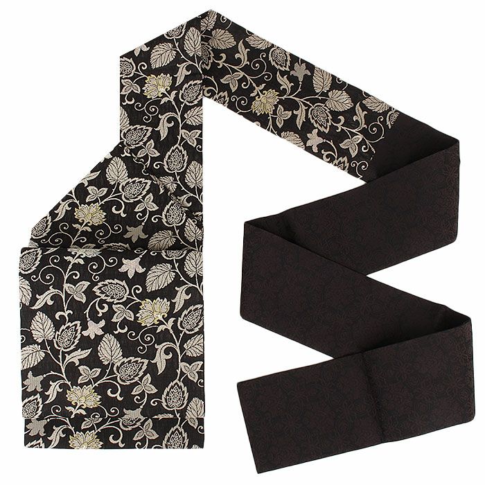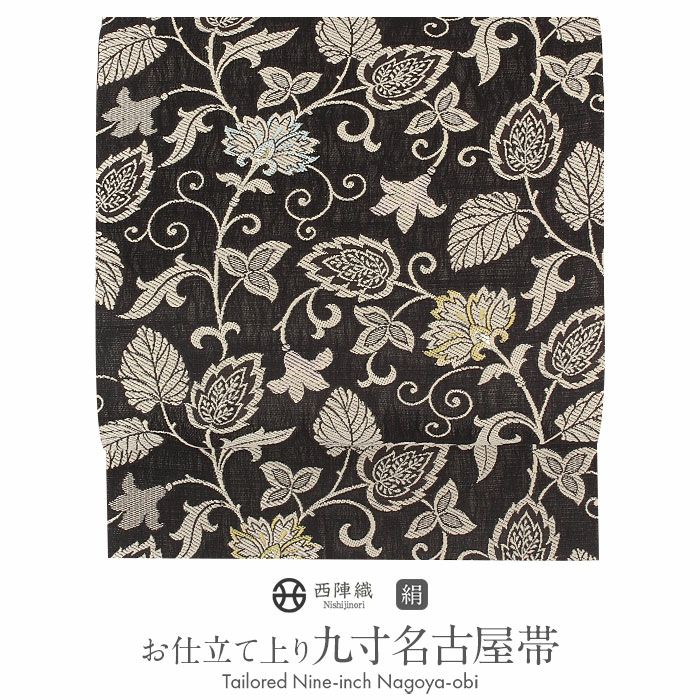 届いてすぐに使える、お仕立て上がりの九寸名古屋帯です。 京都西陣で織り上げられた、西陣証紙のついた確かな品質。 上品な帯ですのでコーディネートしやすく、 小紋や紬、色無地、御召などの着物に最適です。 帯は伝統工芸の西陣織にて仕立てられており、染められた糸を複雑に織って模様を作るので、完成までに多数の工程があり、とても手間暇がかかる高級絹織物です。 こうして丁寧に織られた生地は、先染めしてから織っているので、一般的な染色法の後染めより丈夫でシワになりにくいのが特徴です。 絹の帯は光の当たり方で絹特有の柔らかな光沢が反射し、高級感あふれる美しい帯の質感がお楽しみいただけます。 しなやかな手触りと締め心地の良さを兼ね備え、正絹特有の柔らかな光沢をもつ逸品です。 仕立てはお太鼓結びのしやすい名古屋仕立て。胴前がすでに半分に折られた状態ですので、帯結びが苦手な方でも締めやすく、お稽古事にも最適な帯です。 西陣織の意匠こもった深みのある柄行きが、後ろ姿のお太鼓も胴前も凛とした着姿を演出してくれるでしょう。 ぜひご自身の着物コーディネートに取り入れていただきたい名古屋帯です。