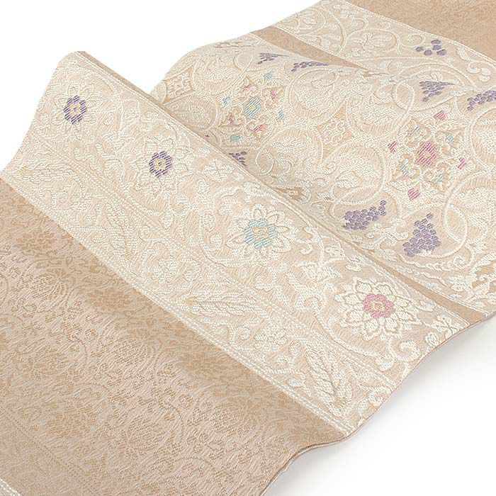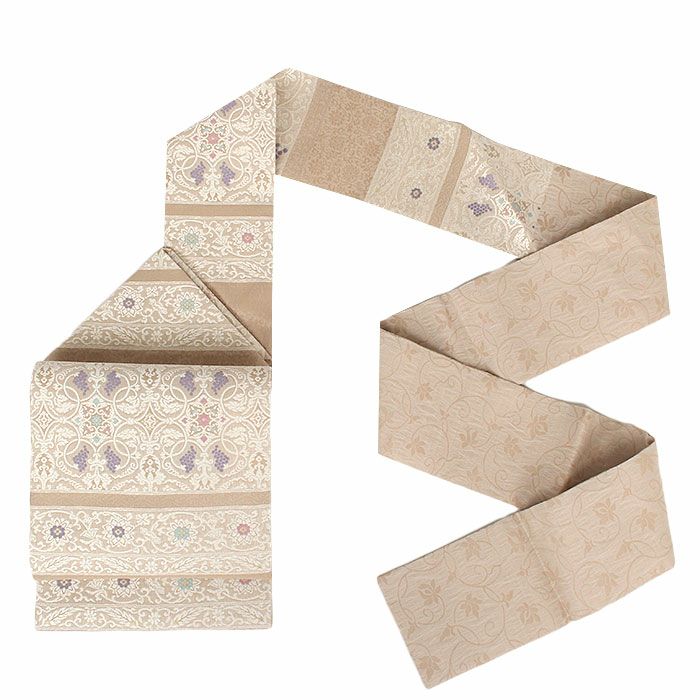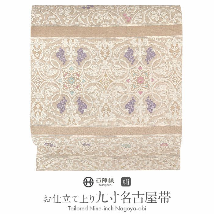 届いてすぐに使える、お仕立て上がりの九寸名古屋帯です。 京都西陣で織り上げられた、西陣証紙のついた確かな品質。 上品な帯ですのでコーディネートしやすく、 小紋や紬、色無地、御召などの着物に最適です。 ベージュを基調とした地に、葡萄・華紋などの文様が繊細に織り込まれており、優雅で落ち着いた雰囲気を醸し出します。 上質な素材と伝統的なデザインが融合したこの名古屋帯は、和装の魅力を一層引き立ててくれることでしょう。 帯は伝統工芸の西陣織にて仕立てられており、染められた糸を複雑に織って模様を作るので、完成までに多数の工程があり、とても手間暇がかかる高級絹織物です。 こうして丁寧に織られた生地は、先染めしてから織っているので、一般的な染色法の後染めより丈夫でシワになりにくいのが特徴です。 絹の帯は光の当たり方で絹特有の柔らかな光沢が反射し、高級感あふれる美しい帯の質感がお楽しみいただけます。 しなやかな手触りと締め心地の良さを兼ね備え、正絹特有の柔らかな光沢をもつ逸品です。 仕立てはお太鼓結びのしやすい名古屋仕立て。胴前がすでに半分に折られた状態ですので、帯結びが苦手な方でも締めやすく、お稽古事にも最適な帯です。 西陣織の意匠こもった深みのある柄行きが、後ろ姿のお太鼓も胴前も凛とした着姿を演出してくれるでしょう。 ぜひご自身の着物コーディネートに取り入れていただきたい名古屋帯です。