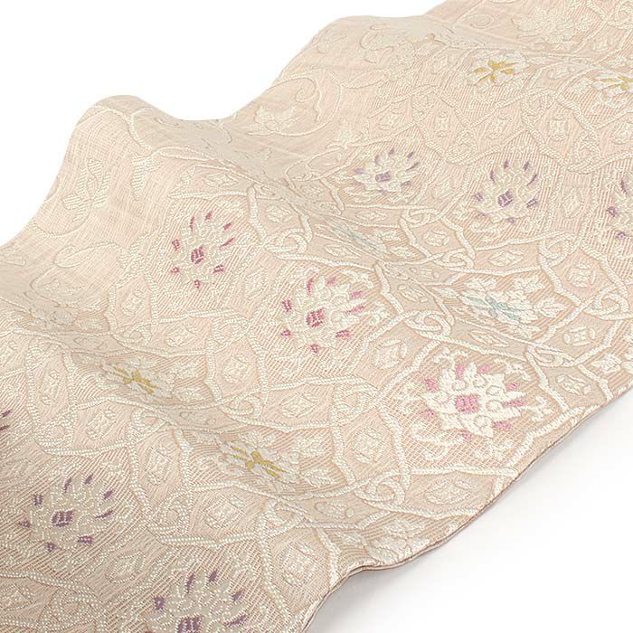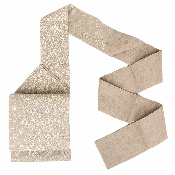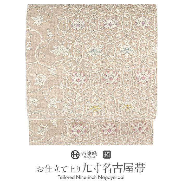 届いてすぐに使える、お仕立て上がりの九寸名古屋帯です。 京都西陣で織り上げられた、西陣証紙のついた確かな品質。 上品な帯ですのでコーディネートしやすく、 小紋や紬、色無地、御召などの着物に最適です。 ベージュを基調とした地に、華紋繋ぎ文様が繊細に織り込まれており、優雅で落ち着いた雰囲気を醸し出します。 上質な素材と伝統的なデザインが融合したこの名古屋帯は、和装の魅力を一層引き立ててくれることでしょう。 帯は伝統工芸の西陣織にて仕立てられており、染められた糸を複雑に織って模様を作るので、完成までに多数の工程があり、とても手間暇がかかる高級絹織物です。 こうして丁寧に織られた生地は、先染めしてから織っているので、一般的な染色法の後染めより丈夫でシワになりにくいのが特徴です。 絹の帯は光の当たり方で絹特有の柔らかな光沢が反射し、高級感あふれる美しい帯の質感がお楽しみいただけます。 しなやかな手触りと締め心地の良さを兼ね備え、正絹特有の柔らかな光沢をもつ逸品です。 仕立てはお太鼓結びのしやすい名古屋仕立て。胴前がすでに半分に折られた状態ですので、帯結びが苦手な方でも締めやすく、お稽古事にも最適な帯です。 西陣織の意匠こもった深みのある柄行きが、後ろ姿のお太鼓も胴前も凛とした着姿を演出してくれるでしょう。 ぜひご自身の着物コーディネートに取り入れていただきたい名古屋帯です。