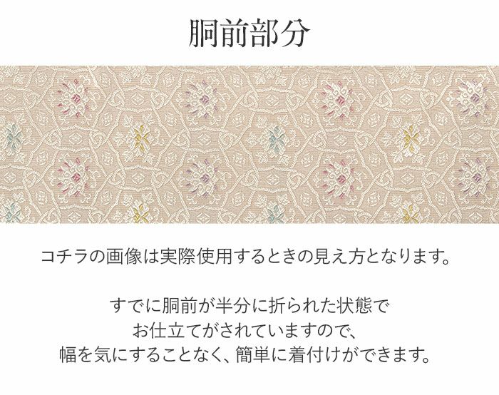 ※実際の商品と同じ色合いに画像修正をしておりますが、環境やモニターの違いにより多少色の違いが出て来ることがあります、ご了承ください。 ※こちらの帯はすでにお仕立てが済んでいる帯です。 ※お仕立ては『名古屋仕立て』となります。