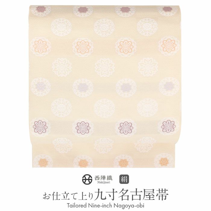 届いてすぐに使える、お仕立て上がりの九寸名古屋帯です。 京都西陣で織り上げられた、西陣証紙のついた確かな品質。 薄いオレンジ色の地に華紋・市松文様が描かれたレトロモダンなデザイン。 上品な帯ですのでコーディネートしやすく、 小紋や紬、色無地、御召などの着物に最適です。 帯は伝統工芸の西陣織にて仕立てられており、染められた糸を複雑に織って模様を作るので、完成までに多数の工程があり、とても手間暇がかかる高級絹織物です。 こうして丁寧に織られた生地は、先染めしてから織っているので、一般的な染色法の後染めより丈夫でシワになりにくいのが特徴です。 絹の帯は光の当たり方で絹特有の柔らかな光沢が反射し、高級感あふれる美しい帯の質感がお楽しみいただけます。 しなやかな手触りと締め心地の良さを兼ね備え、正絹特有の柔らかな光沢をもつ逸品です。 仕立てはお太鼓結びのしやすい名古屋仕立て。胴前がすでに半分に折られた状態ですので、帯結びが苦手な方でも締めやすく、お稽古事にも最適な帯です。 西陣織の意匠こもった深みのある柄行きが、後ろ姿のお太鼓も胴前も凛とした着姿を演出してくれるでしょう。 ぜひご自身の着物コーディネートに取り入れていただきたい名古屋帯です。