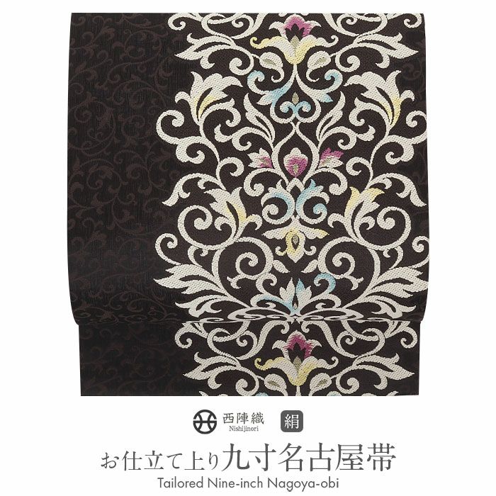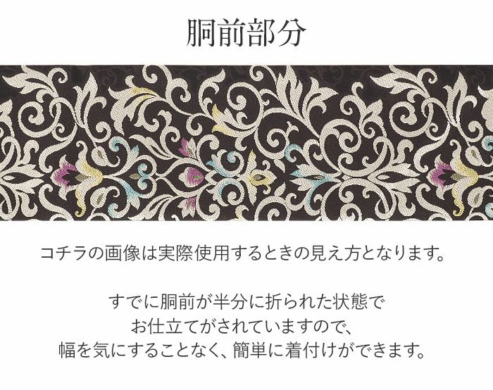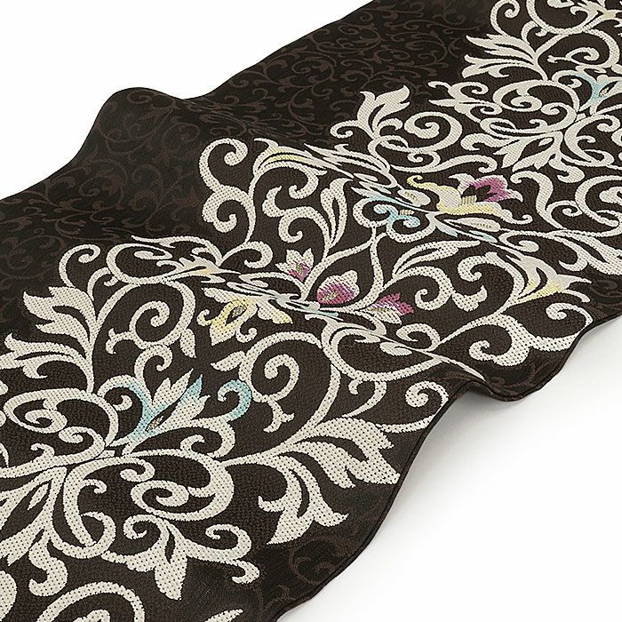落ち着いた黒の帯地に、白を基調として、水色・ピンク・黄色など鮮やかな色彩で織り込まれたアラベスクの文様がエレガントな印象を与えます。