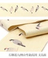 京都西陣の老舗である酒井守謹製のカジュアル半幅帯です。 江戸時代後期の伊勢国長島藩主でありながら、画家としても活躍した石顛道人(増山雪斎)「百鳥図」から文鳥を贅沢に帯に描きました。 桜色のくちばしが目を引く文鳥たちのかわいい仕草が描かれた帯は、小鳥好きにはもちろん見る人を楽しませ粋な着姿を演出します。 お洒落な柄が着姿を華やかに彩るリバーシブル小袋帯は、 裏側をちらりと見せてワンポイントにしてみたり、リボン結びで裏と表両方見せてみたり、 色々な結び方で着物姿を粋に演出することができます。 和アート柄がお好きな方はもちろん、粋な着こなしがお好きな方にも。 小紋や紬などの普段のお着物にあわせてみたり、注目を集めること間違いなしの1本です。