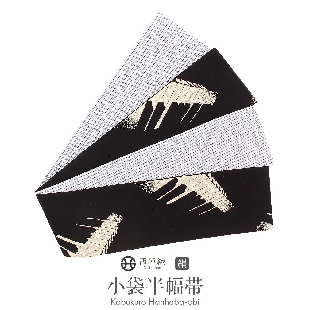 京都西陣の老舗である田中伝機業店謹製のカジュアル半幅帯をご用意致しました。 こちらの半幅帯は表地が西陣織、裏地がしじら織の高級感と実用性を兼ね備えた逸品です。 西陣織にて仕立てられた帯は、絹の艶やかな光沢が魅力的。 裏地は阿波しじら織の特徴であるシボがあることで肌触りがよく、汗をかいても肌に張りつかない 爽やかな締め心地です。 お洒落な柄が着姿を華やかに彩るリバーシブル小袋帯は、 裏側をちらりと見せてワンポイントにしてみたり、リボン結びで裏と表両方見せてみたり、 色々な結び方で着物姿を粋に演出することができます。 表地は、黒の生地にピアノが描かれており、スタイリッシュで大人かっこいい印象です。 裏地は、白地に格子がお洒落な小袋帯。 見る人を楽しませる魅力的な帯は、粋な着姿を演出します。 小紋や紬などのカジュアルな装いをはじめ、浴衣や街着など気軽に締めていただきたい逸品です。
