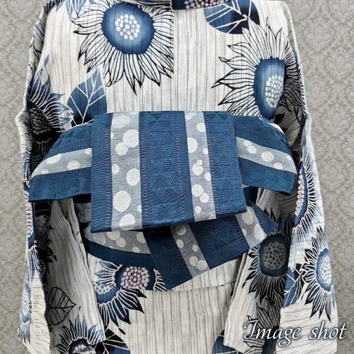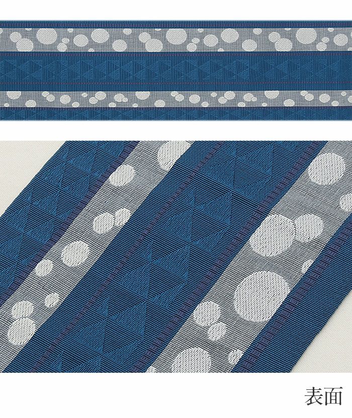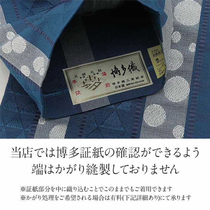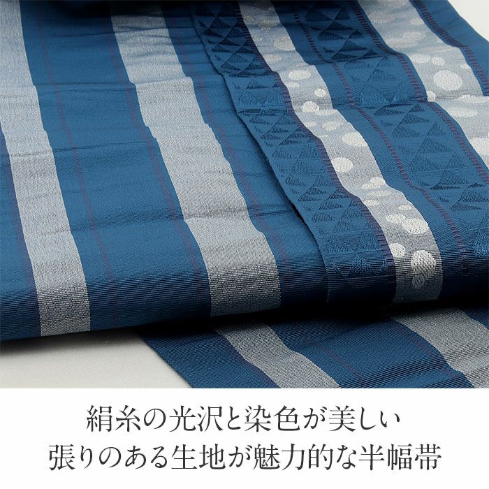 本場筑前博多織 小野織物の正絹半幅帯です。 その締め心地のよさから多くのきもの愛好家に好まれているお品です。 表は、青地に縞や鱗・水玉模様が描かれた、大人可愛いデザイン。 裏は、表と同じ色合いで縞模様が描かれたシンプルな文様。 絹糸で織り上げているため、通気性や吸湿性に優れ、季節を問わずお使いいただけます。 締め心地も気持ちがよく、「キュッ」とした絹鳴りが響くほど。締まりやすく緩まないのも博多帯ならではです。 しっかりと打ち込まれた緯糸が絹の光沢と生地のツヤ・ハリを持たせ、人と差がつく着姿を演出します。 気軽なお稽古事はもちろん、観劇、芸術鑑賞、ショッピング、ちょっとしたお出掛け等ご活用の幅も広いでしょう。 十分な長さがあるので、結び方によっても様々な表情を演出してくれます。 貝ノ口やかるた結びなどの小粋でスマートな帯結びから、三重仮紐を使ったボリュームのある変わり結びまで楽しめるのが半幅帯の魅力です。 1本増えるだけで着物コーディネートの楽しみがグッと広がる半幅帯、ぜひワードローブに加えてみてはいかがでしょうか。