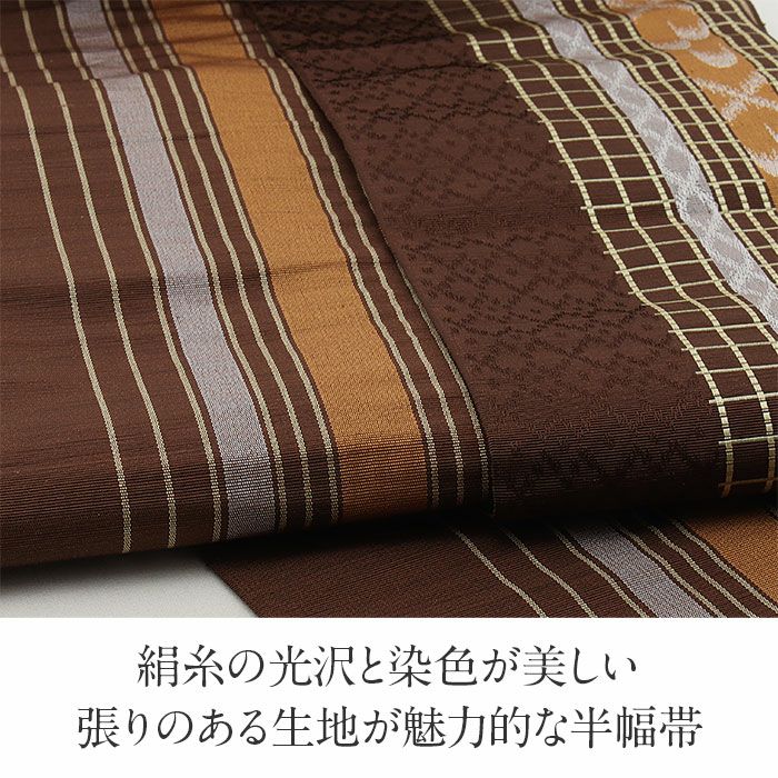 本場筑前博多織 小野織物の正絹半幅帯です。 本場筑前博多織は、その締め心地の良さから多くのきもの愛好家に愛されている逸品です。 表は、落ち着いた茶色の帯地に格子柄などが描かれた、上品なデザイン。 裏は、同色地に縞模様が入ったシンプルなデザインで、どちらも魅力的です。 絹糸で織り上げられているため、通気性や吸湿性に優れ、季節を問わず快適にお使いいただけます。 締め心地も抜群で、「キュッ」とした絹鳴りが響くほどの締まりやすさと緩まない特性は、博多帯ならではの魅力です。 しっかりと打ち込まれた緯糸が絹の光沢と生地のツヤ・ハリを持たせ、人と差がつく着姿を演出します。 気軽なお稽古事はもちろん、観劇、芸術鑑賞、ショッピング、ちょっとしたお出掛けなど、幅広いシーンでご活用いただけます。 十分な長さがあり、結び方によって様々な表情を演出できるのも魅力の一つです。 貝ノ口やかるた結びなどの小粋でスマートな帯結びから、三重仮紐を使ったボリュームのある変わり結びまで楽しめる半幅帯は、1本増えるだけで着物コーディネートの楽しみがグッと広がります。 ぜひ、この素敵な半幅帯をワードローブに加えて、着物ライフをさらに充実させてみませんか?