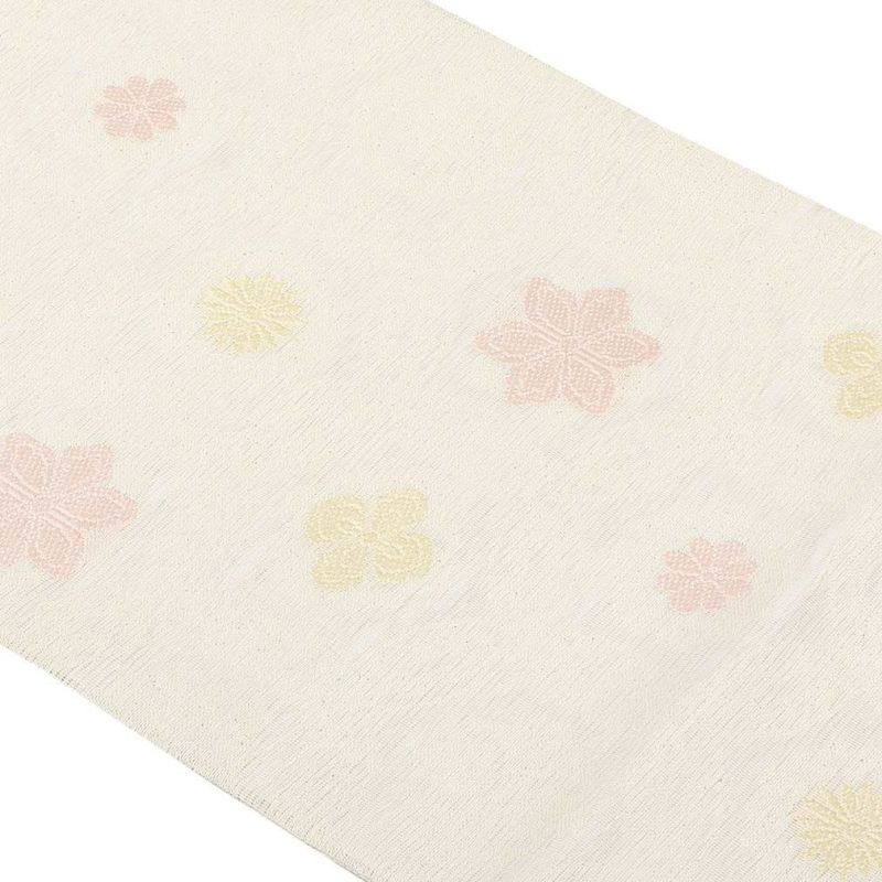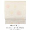 届いて直ぐに使える夏用のお仕立て上がりの名古屋帯です。 京都西陣で織り上げられ、西陣織の証紙が付いた品質確かな逸品。 白地に丸紋つなぎを織り込んだ格調高い名古屋帯です。 絽織の透け感が涼し気にうつり、夏の装いを優雅に演出します。 付下げから小紋や紬などのカジュアルな装いにピッタリの名古屋帯、 気軽なお出掛けなどに合わせてご利用ください。 本商品は絹糸で織られ、しなやかで手触りも良く通気性に優れ、6月から8月までご使用できます。 柄もたれ先から前腹まで続いている柄付けですので、帯結びが苦手な方でも、着物初心者の方でも気軽に締めて頂けます。