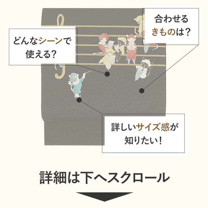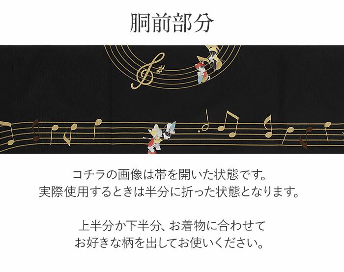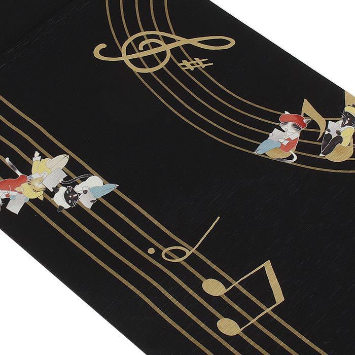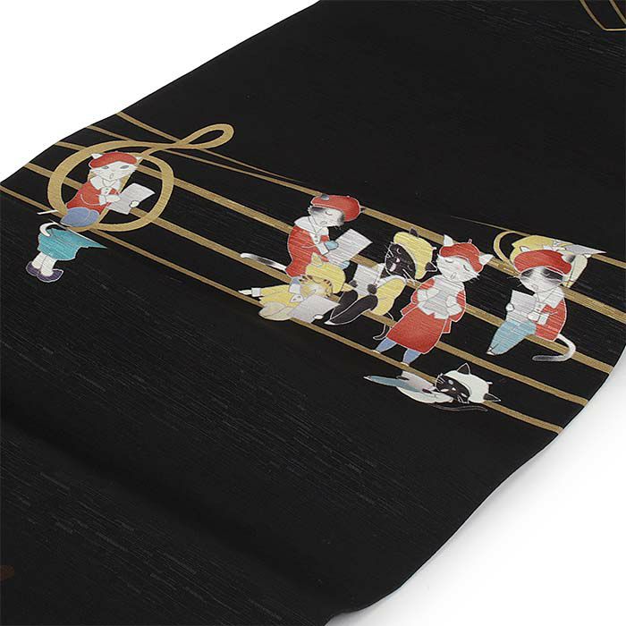 京袋帯 正絹 黒 Let’s Sing 猫 WAKKA 仕立て上がり おび なごや帯 名古屋帯 カジュアル おしゃれ 普段用 未使用 新品 春 秋 冬