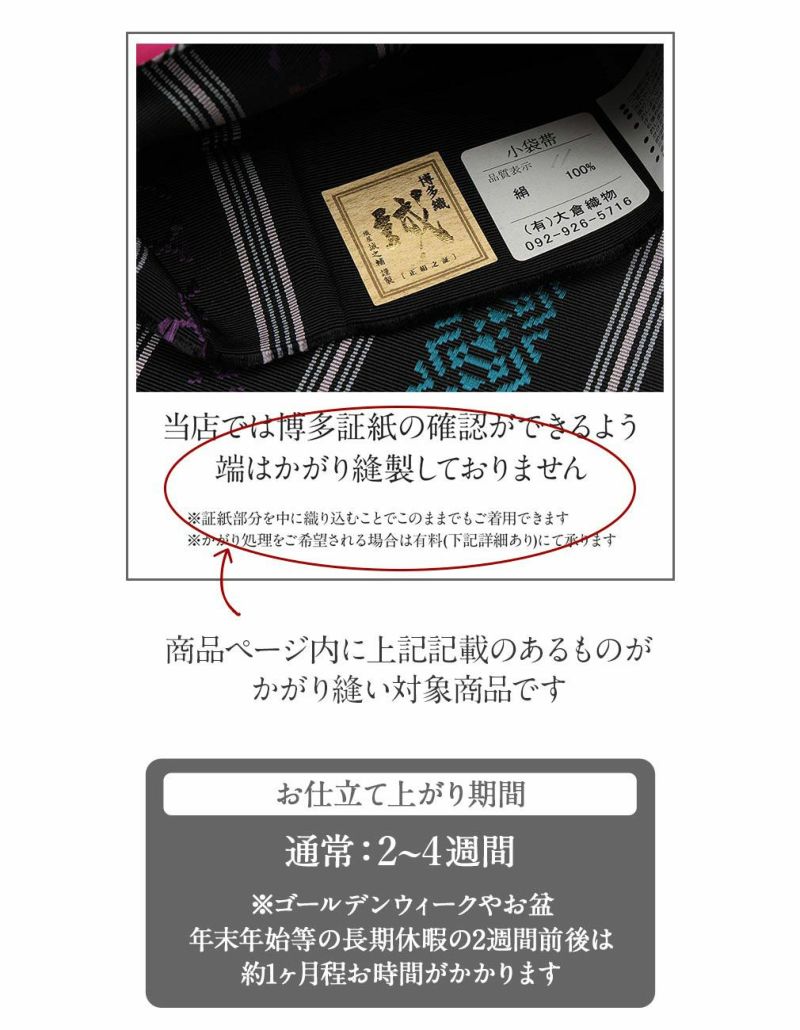 他の画像を見る 《お仕立て上り・送料込》【最短日お届け】お稽古や小紋・紬・色無地などカジュアルな着物に 名古屋帯 夏 黒 九寸 帯 華紋 西陣織 佐々木染織 お仕立て上がり 六通柄 正絹 当店特別価格 ¥ 22,000 税込 (0) カートに入れる お気に入りに登録する
