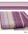 本場筑前博多織 小野織物の正絹半幅帯です。 本場筑前博多織は、その締め心地のよさから多くのきもの愛好家に好まれているお品です。 ■表は赤紫地を基調に、薄黄や薄紫に藍色を組み合わせた縞模様が配され、白糸で織り出された唐花文様が上品に映えます。 色のコントラストが絶妙で、モダンさと伝統美を兼ね備えた一本。 ■裏は、同色地のシンプルなデザインで、どちらも魅力的です。 絹糸で織り上げられているため、通気性や吸湿性に優れ、季節を問わず快適にお使いいただけます。 締め心地も抜群で、「キュッ」とした絹鳴りが響くほどの締まりやすさと緩まない特性は、博多帯ならではの魅力です。 しっかりと打ち込まれた緯糸が絹の光沢と生地のツヤ・ハリを持たせ、人と差がつく着姿を演出します。 お稽古事はもちろん、観劇、芸術鑑賞、ショッピング、ちょっとしたお出掛け等ご活用の幅も広いでしょう。 適度に長さがあり、結び方によって様々な表情を演出できるのも魅力の一つです。 貝ノ口やかるた結びなどの小粋でスマートな帯結びから、三重仮紐を使ったボリュームのある変わり結びまで楽しめる半幅帯は、1本増えるだけで着物コーディネートの楽しみがグッと広がります。 ぜひ、この素敵な半幅帯をワードローブに加えて、着物ライフをさらに充実させてみませんか?