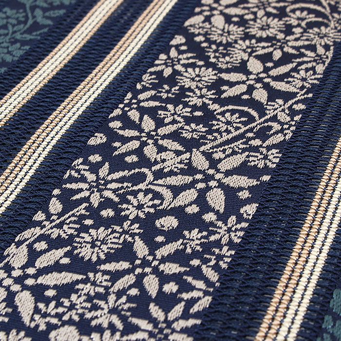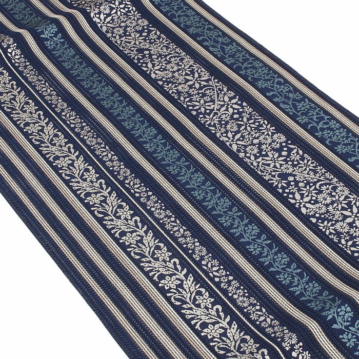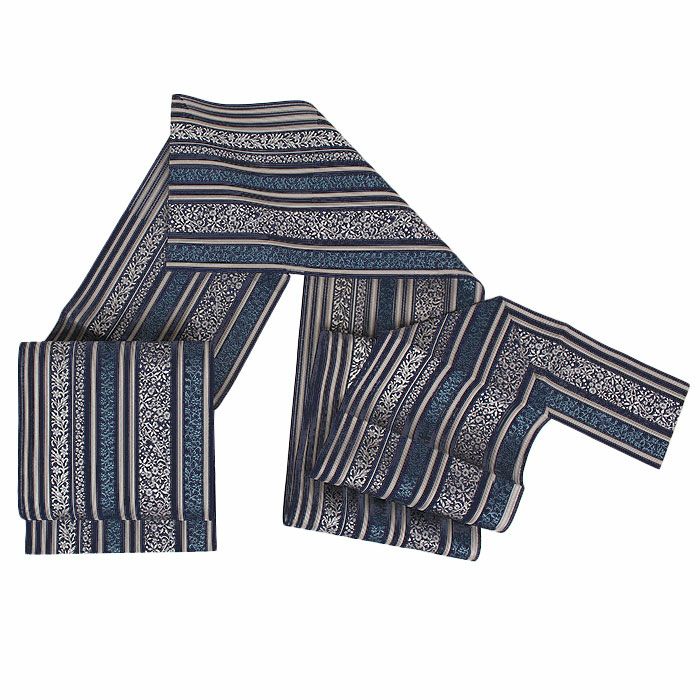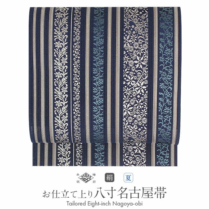 届いて直ぐに使えるお仕立て上がりの博多織 夏用 八寸名古屋帯です。 本場筑前博多織は、その締め心地のよさから多くのきもの愛好家に好まれているお品です。 上品な帯ですのでコーディネートしやすく、 また透け感のある涼し気な印象の帯ですので、初夏・盛夏・晩夏の小紋や紬、色無地、御召などの着物に最適です。 深みのある紺色に織り込まれた様々な蔓花文様と間道が、しっとりと大人の印象を演出してくれます。 シックな色合いなので着物や小物の色も邪魔することなく、コーディネートがまとまりやすいので一本持っておくと重宝するお色となっています。 絹糸100%で織り上げているため通気性や吸湿性に優れていることに加え、帯芯もなく透け感のある博多織の夏帯は最も涼しくお召しいただける名古屋帯といえるでしょう。 締め心地も気持ちがよく、「キュッ」とした絹鳴りが響くほど。締まりやすく緩まないのも博多帯ならではです。 帯のどこをとっても柄が連なった「全通柄」ですので、柄出しの難しさもありません。着物初心者さんにも締めていただきやすい帯です。 しっかりと打ち込まれた緯糸が絹の光沢と生地のツヤ・ハリを持たせ、人と差がつく着姿を演出します。 茶道や華道等のお稽古事はもちろん、観劇、芸術鑑賞、ショッピング、ちょっとしたお出掛け等幅広くご活用いただけます。 凛と美しく形が決まる一重太鼓や小粋なふくらみの銀座結びで、本場筑前博多織の帯をご堪能下さい。
