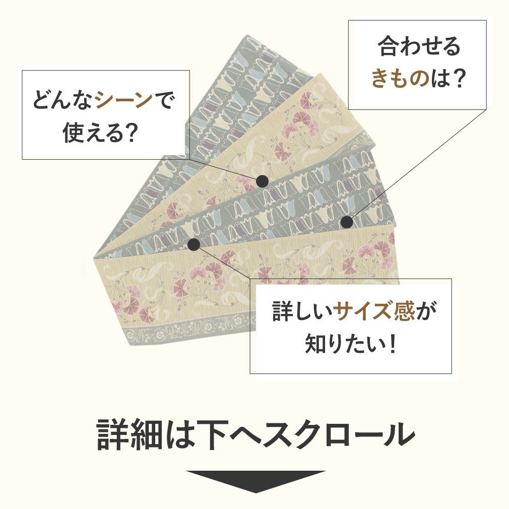 他の画像を見る ≪在庫限り≫ 西陣織 長尺で色々な結び方が楽しめる半幅帯 半幅帯 正絹 帯 半巾帯 普段用 ベージュ 藍色 薄グレー 紫 生成り 花更紗 波紋 リバーシブル 西陣織 大光織物 カジュアル 長尺 日本製 当店特別価格 ¥ 26,400 税込 カートに入れる お気に入りに登録する
