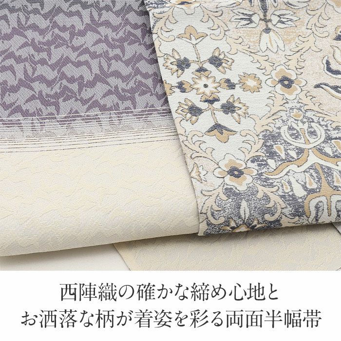 他の画像を見る ≪在庫限り≫ 西陣織 長尺で色々な結び方が楽しめる半幅帯 半幅帯 正絹 帯 半巾帯 普段用 ベージュ 紫 薄グレー 花更紗 波紋 リバーシブル 西陣織 大光織物 カジュアル 長尺 日本製 当店特別価格 ¥ 26,400 税込 カートに入れる お気に入りに登録する