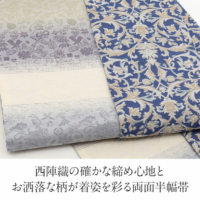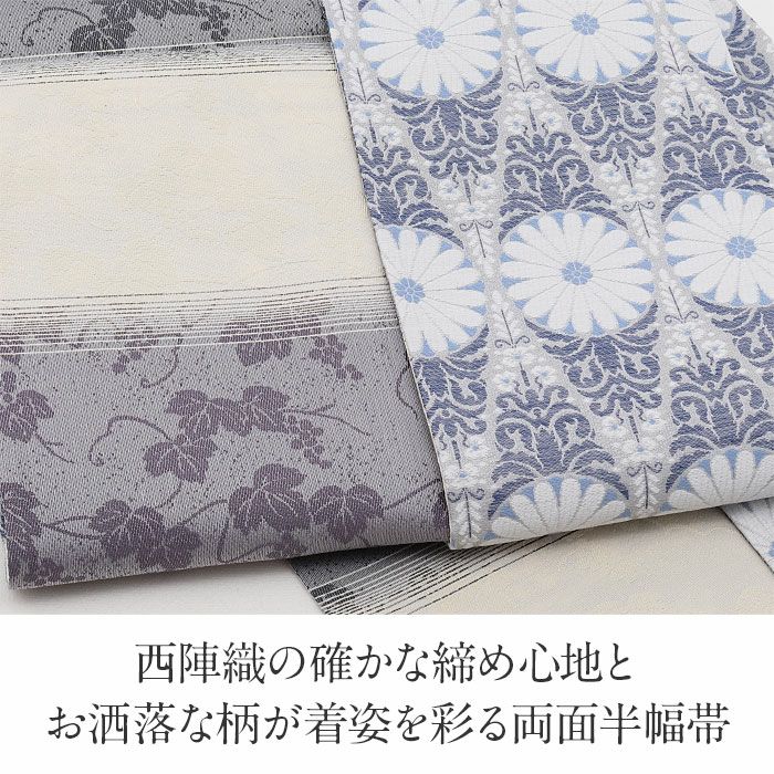他の画像を見る ≪在庫限り≫ 西陣織 長尺で色々な結び方が楽しめる半幅帯 半幅帯 正絹 帯 半巾帯 普段用 グレー 青 紫 生成り 菊唐草 縞 葡萄 リバーシブル 西陣織 大光織物 カジュアル 長尺 日本製 当店特別価格 ¥ 26,400 税込 カートに入れる お気に入りに登録する