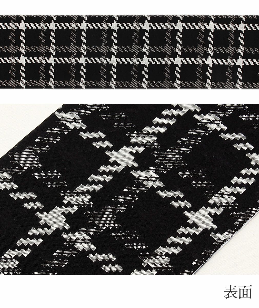 京都西陣の老舗である田中伝機業店謹製のカジュアル半幅帯をご用意致しました。 こちらの半幅帯は表地が西陣織、裏地がしじら織の高級感と実用性を兼ね備えた逸品です。 西陣織にて仕立てられた帯は、絹の上品な光沢が魅力的。 裏地は阿波しじら織の特徴であるシボがあることで肌触りがよく、汗をかいても肌に張りつかない 爽やかな締め心地です。 お洒落な柄が着姿を華やかに彩るリバーシブル小袋帯は、 裏側をちらりと見せてワンポイントにしてみたり、リボン結びで裏と表両方見せてみたり、 色々な結び方で着物姿を粋に演出することができます。 表地は、シックな黒の生地にシルバーで格子文様が描かれており、モダンでお洒落なデザインです。 裏地は、白地に黒の縞模様が粋な小袋帯。 見る人を楽しませる帯は、魅力的な着姿を演出します。 小紋や紬などのカジュアルな装いをはじめ、浴衣や街着など気軽に締めていただきたい逸品です。