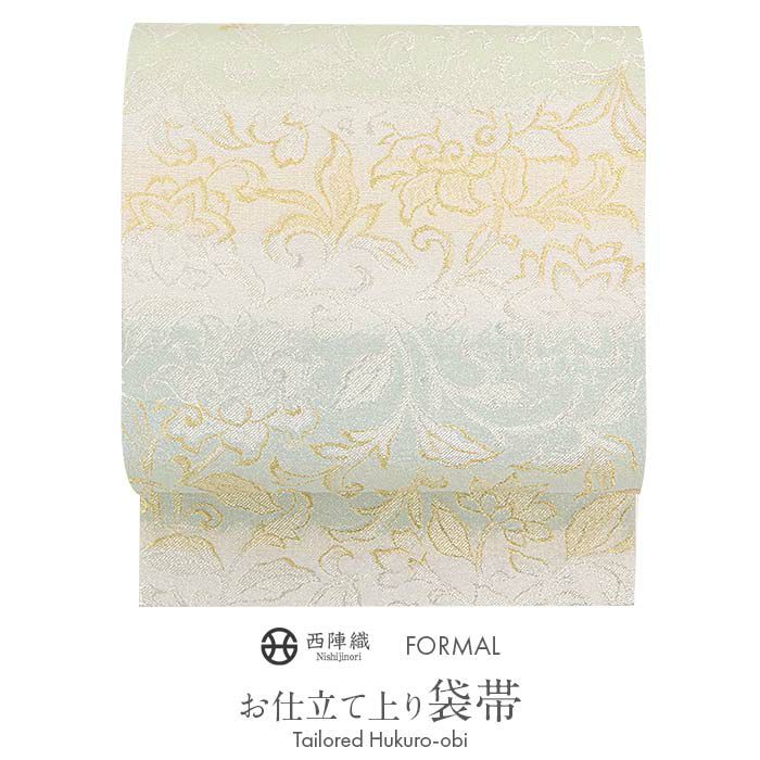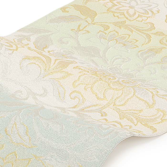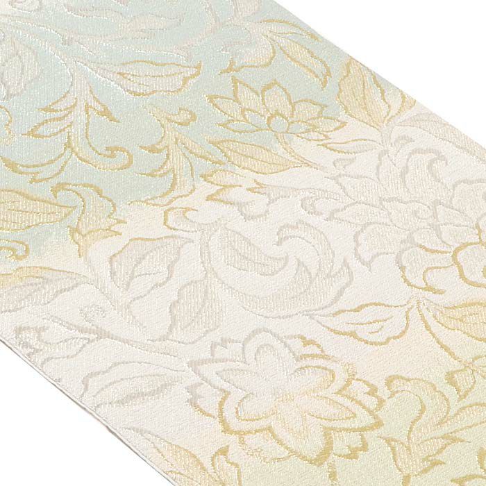 袋帯 帯 礼装用 緑 薄青 銀 グラデーション 唐花 浅田叡一 西陣織 仕立て上がり 新品 未使用 正絹