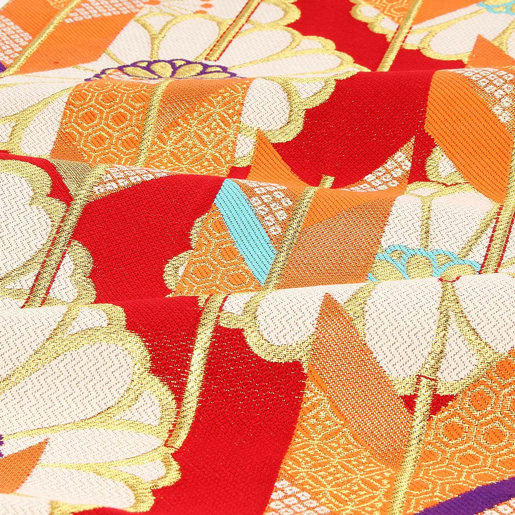 振袖にお使いいただける、西陣織お仕立て上り袋帯です。 一面に並んだ矢絣には、亀甲や七宝を始めとした吉祥文が入れ込まれ、祝意を示す晴れの日に相応しい帯です。 矢絣から覗く橙の菊や桜などは、存在感があり帯元を粋に演出します。 帯は伝統工芸の西陣織にて仕立てられており、染められた糸を複雑に織って模様を作るので、完成までに多数の工程があり、とても手間暇がかかる高級絹織物です。 こうして丁寧に織られた生地は、先染めしてから織っているので、一般的な染色法の後染めより丈夫でシワになりにくいのが特徴です。 光の当たり方で、絹の柔らかな光沢が反射し、艶やかな帯がお楽しみいただけます。 絹の質感と光沢、大胆で鮮麗な柄が、大切なお祝いの席を華やかに演出してくれるでしょう。 結婚式やパーティーでの振袖はもちろん、一度きりの成人式に相応しい豪華な逸品です。