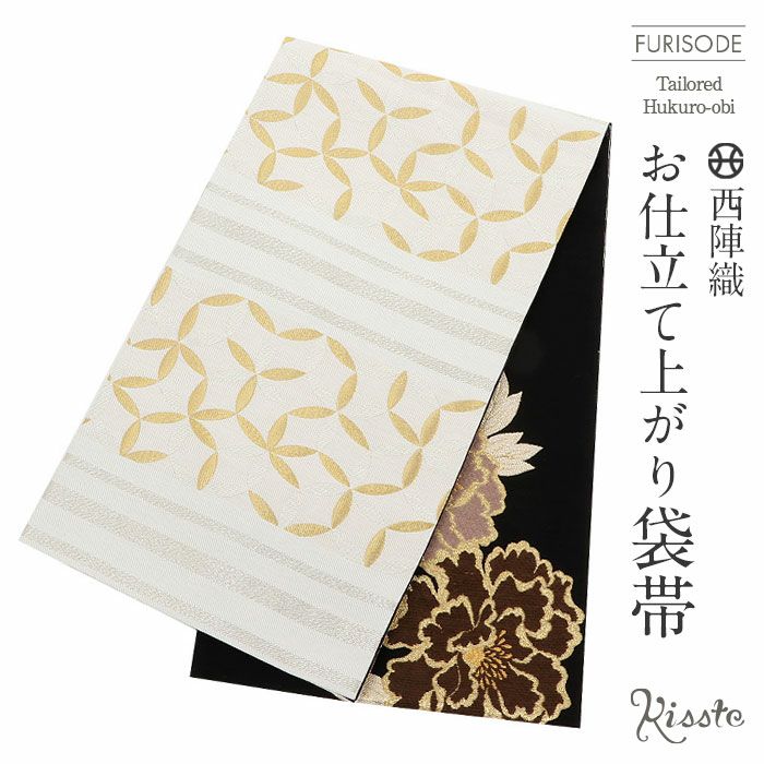 振袖にお使いいただける、西陣織お仕立て上り袋帯です。 こちらの帯は、胴前部分とその他の色柄が異なるデザインで、前後で印象の変化をお楽しみいただけます。 胴前は黒地に牡丹柄で、シンプルで凛とした帯元を印象的に演出します。 リボン結びとなる部分は、アイボリー地に金糸とラメ糸の七宝柄とシルバーのラインで、煌びやかな輝きが振袖姿に華を添えます。 帯は伝統工芸の西陣織にて仕立てられており、染められた糸を複雑に織って模様を作るので、完成までに多数の工程があり、とても手間暇がかかる高級絹織物です。 こうして丁寧に織られた生地は、先染めしてから織っているので、一般的な染色法の後染めより丈夫でシワになりにくいのが特徴です。 光の当たり方で、絹の柔らかな光沢が反射し、艶やかな帯がお楽しみいただけます。 絹の質感と光沢、大胆で鮮麗な柄が、大切なお祝いの席を華やかに演出します。 結婚式やパーティーでの振袖はもちろん、一度きりの成人式に相応しい豪華な逸品です。