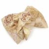 振袖にお使いいただける、西陣織お仕立て上り袋帯です。 落ち着いた色合いのベージュ地に煌めくゴールド・オレンジ・レッドなどで、蝶や華紋が大胆かつ繊細に描かれ帯元を華やかに演出します。 贅沢に使用された金糸の美しい輝きが帯周りを豪華に彩り、大切な日の振袖姿に華を添えます。 王道のスタイルからレトロ、モダンスタイルまで合わせやすく、様々なコーディネートがお楽しみいただけますよ。 帯は伝統工芸の西陣織にて仕立てられており、染められた糸を複雑に織って模様を作るので、完成までに多数の工程があり、とても手間暇がかかる高級絹織物です。 こうして丁寧に織られた生地は、先染めしてから織っているので、一般的な染色法の後染めより丈夫でシワになりにくいのが特徴です。 光の当たり方で、絹の柔らかな光沢が反射し、艶やかな帯がお楽しみいただけます。 絹の質感と光沢、大胆で鮮麗な柄が、大切なお祝いの席を華やかに演出してくれるでしょう。 結婚式やパーティーでの振袖はもちろん、一度きりの成人式に相応しい豪華な逸品です。