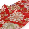 成人式や結婚式、振袖にお使いいただける、西陣織お仕立て上り袋帯です。 鮮やかな赤地に織り込まれた華紋とリボンは、華やかでありながら古風な雰囲気を持ち合わせ、どんな振袖にもお洒落なアクセントを加えます。 帯は伝統工芸の西陣織にて仕立てられており、染められた糸を複雑に織って模様を作るので、完成までに多数の工程があり、とても手間暇がかかる高級絹織物です。 こうして丁寧に織られた生地は、先染めしてから織っているので、一般的な染色法の後染めより丈夫でシワになりにくいのが特徴です。 綿密に織られた西陣織は糸数も多く、ぐっと締まって緩みにくいので、着姿もしゃんと背筋が伸びます。 絹の帯には、金糸を使用しており、魅入ってしまうほどの美しい輝きが魅力的。 光の当たり方で、絹特有の柔らかな光沢や金銀糸が反射し、高級感あふれる美しい帯がお楽しみいただけます。 絹の質感と光沢、大胆で鮮麗な柄が、大切なお祝いの席を華やかに演出してくれるでしょう。 結婚式やパーティーでの振袖はもちろん、一度きりの成人式に相応しい豪華な逸品です。