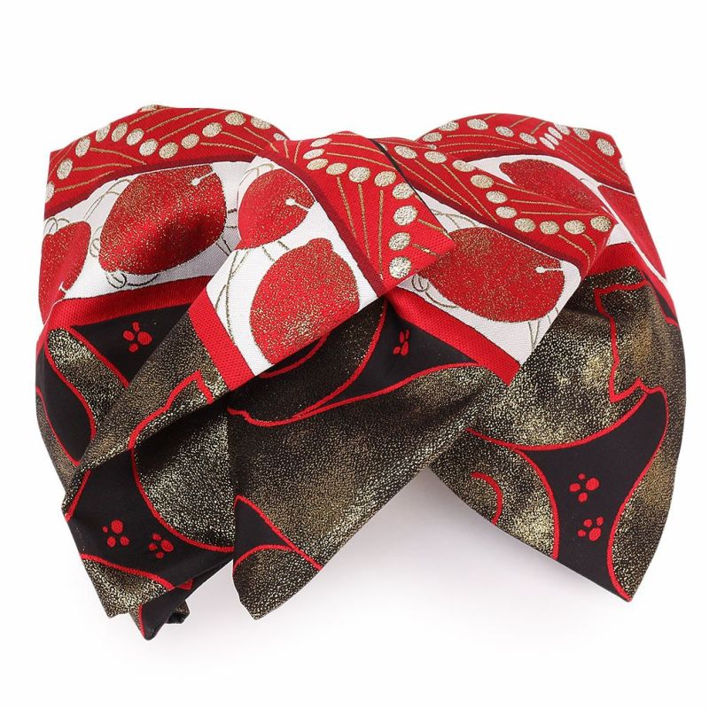 振袖にお使いいただける、西陣織お仕立て上り袋帯です。 黒×赤地に煌びやかな猫や鈴などが映える豪華なデザインで美しい装飾が帯全体を彩ります。 帯は伝統工芸の西陣織にて仕立てられており、染められた糸を複雑に織って模様を作るので、完成までに多数の工程があり、とても手間暇がかかる高級絹織物です。 こうして丁寧に織られた生地は、先染めしてから織っているので、一般的な染色法の後染めより丈夫でシワになりにくいのが特徴です。 正絹の帯には、金糸をふんだんに使用しており、魅入ってしまうほどの美しい輝きが魅力的。 光の当たり方で、絹の柔らかな光沢や金糸が反射し、豪華絢爛な帯がお楽しみいただけます。 絹の質感と光沢、大胆で鮮麗な柄が、大切なお祝いの席を華やかに演出いたします。 結婚式やパーティーでの振袖はもちろん、一度きりの成人式に相応しい豪華な逸品です。