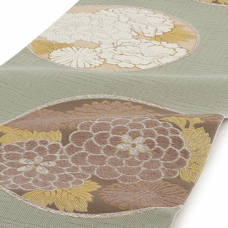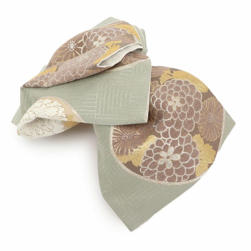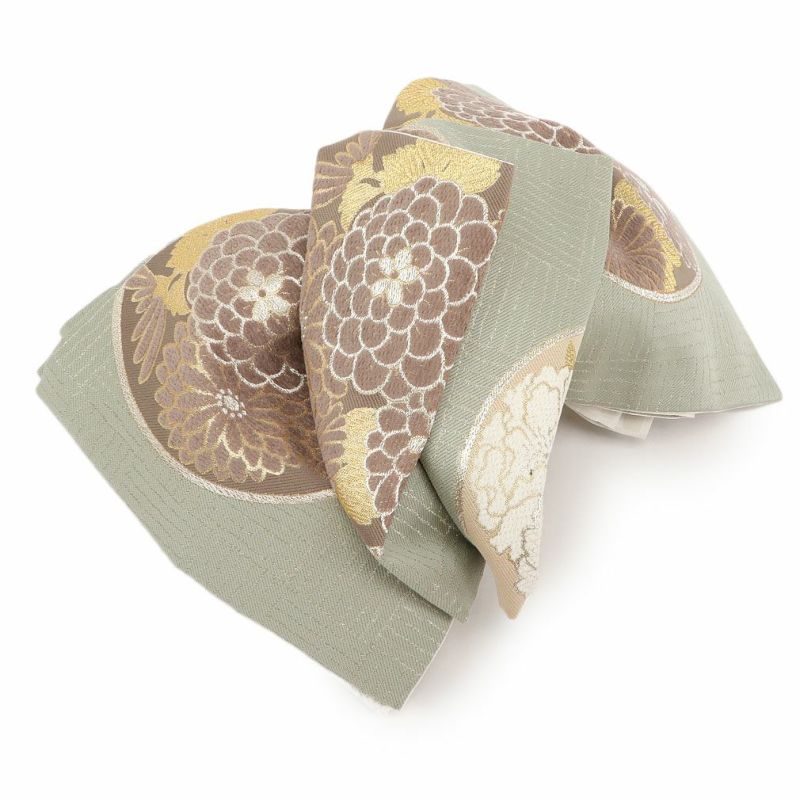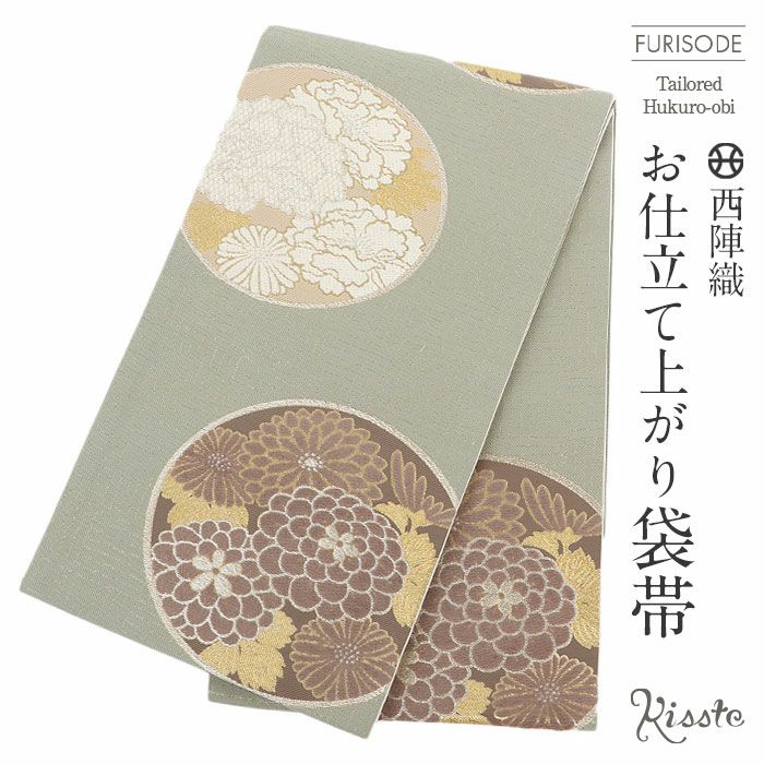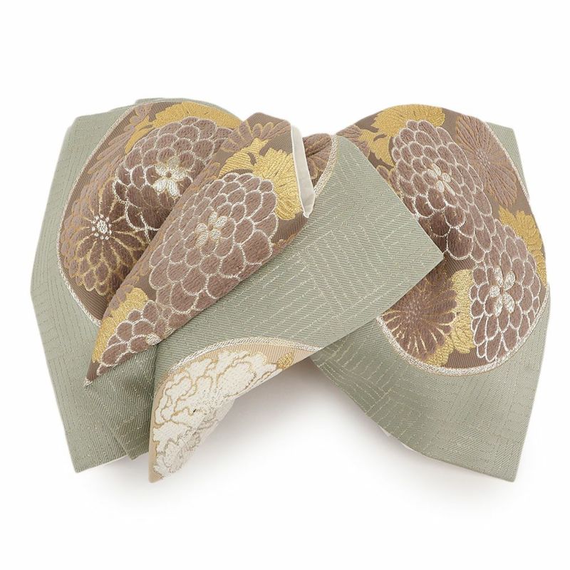 振袖にお使いいただける、西陣織お仕立て上り袋帯です。 少しくすんだ緑の地色に、白・薄茶色の牡丹や万寿菊などが描かれ、印象的な和モダンの色使いで帯元を上品に演出します。 花柄の部分にはモール糸を使用した立体感のある織文様が施され、奥行きと深みを感じさせてくれます。 さらに縁取り部分には金糸が使用されており、キラキラとした上品な輝きが帯周りを煌びやかに彩り振袖姿に華を添えます。 帯は伝統工芸の西陣織にて仕立てられており、染められた糸を複雑に織って模様を作るので、完成までに多数の工程があり、とても手間暇がかかる高級絹織物です。 こうして丁寧に織られた生地は、先染めしてから織っているので、一般的な染色法の後染めより丈夫でシワになりにくいのが特徴です。 光の当たり方で、絹の柔らかな光沢が反射し、艶やかな帯がお楽しみいただけます。 絹の質感と光沢、大胆で鮮麗な柄が、大切なお祝いの席を華やかに演出します。 結婚式やパーティーでの振袖はもちろん、一度きりの成人式に相応しい豪華な逸品です。