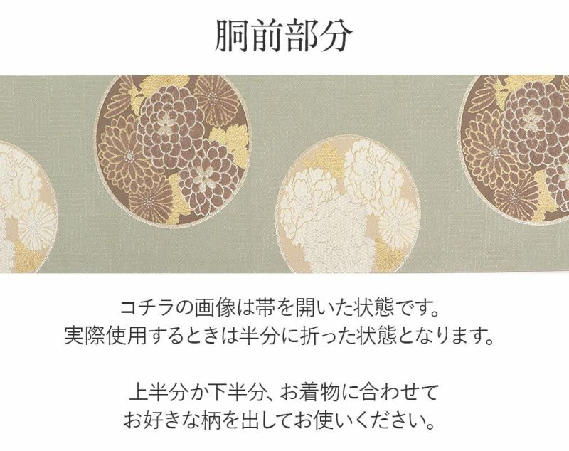 ●実際の商品と同じ色合いに画像修正をしておりますが、環境やモニターの違いにより多少色の違いが出て来ることがあります、ご了承ください。 ●生地の取り方により、柄の出方が異なる場合がございます。 ●こちらの帯はすでにお仕立てが済んでいる帯です。 ●お仕立ては【袋帯仕立て】となります。