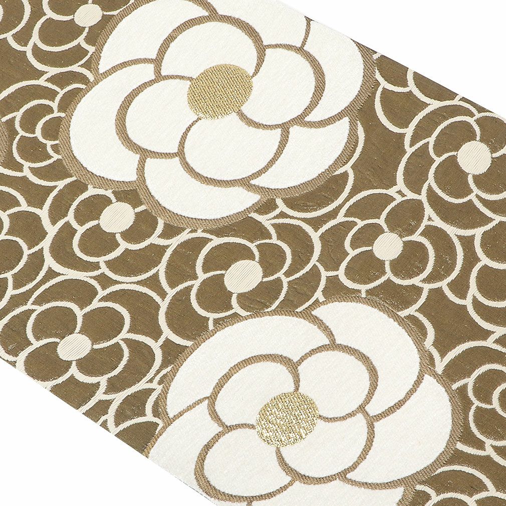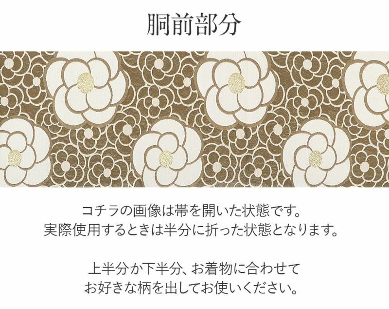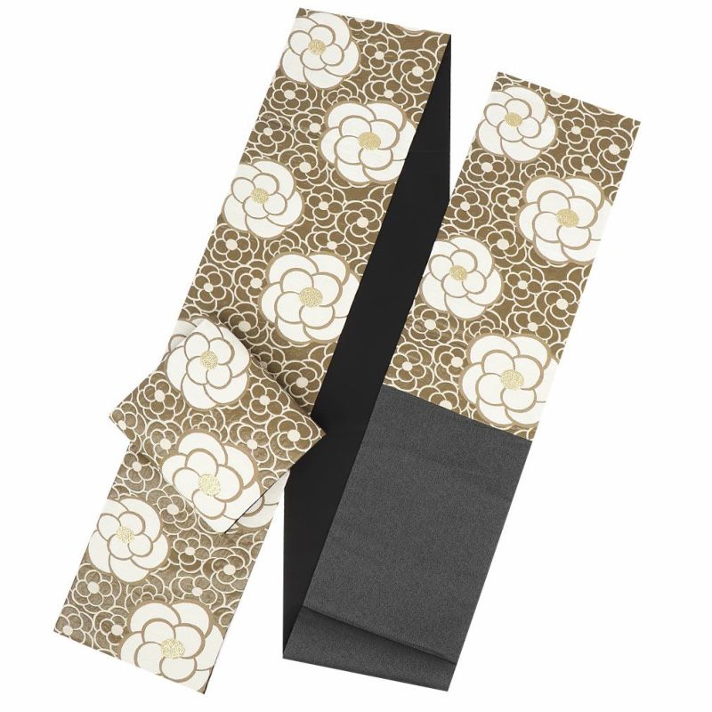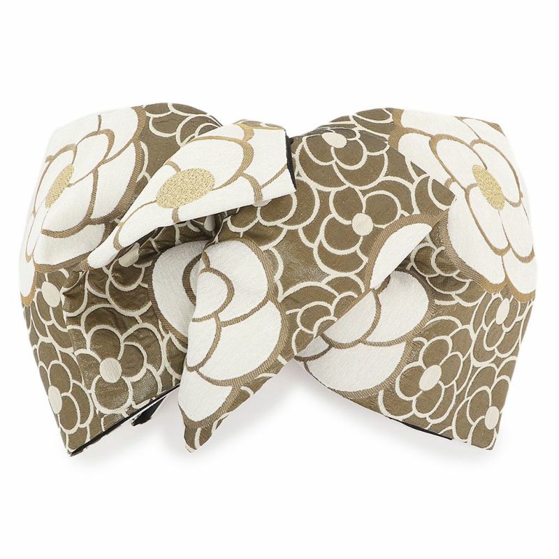 振袖にお使いいただけるお仕立て上り袋帯です。 ブラウン寄りのカーキの地色に、白や金糸などで描かれたカメリアが帯元を華やかに可愛らしく演出します。 花の中心部に金糸を使用しており、ゴージャスな輝きが帯周りを煌びやかに彩り振袖姿に華を添えます。 王道のスタイルからレトロ、個性派まで合わせやすく様々なコーディネートがお楽しみいただけます。 光の当たり方で、絹の柔らかな光沢が反射し、艶やかな帯がお楽しみいただけます。 絹の質感と光沢、大胆で鮮麗な柄が、大切なお祝いの席を華やかに演出します。 結婚式やパーティーでの振袖はもちろん、一度きりの成人式に相応しい豪華な逸品です。