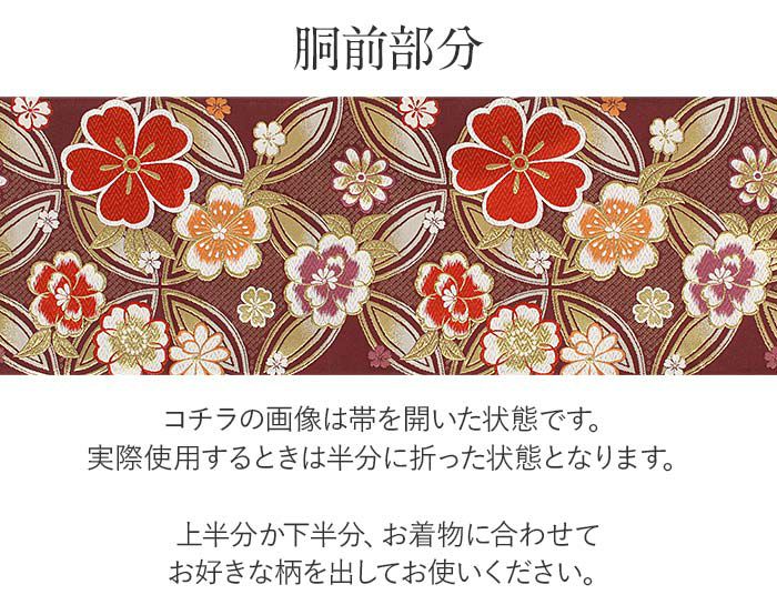 ※実際の商品と同じ色合いに画像修正をしておりますが、環境やモニターの違いにより多少色の違いが出て来ることがあります、ご了承ください。 ※生地の取り方により、柄の出方が異なる場合がございます。 ※こちらの帯はすでにお仕立てが済んでいる帯です。 ※お仕立ては『袋帯仕立て』となります。