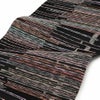 シックな黒の帯地にピンクや橙、緑などでスクエア状のライン模様をカラフルに織り込んだモダンでお洒落な印象の袋帯です。