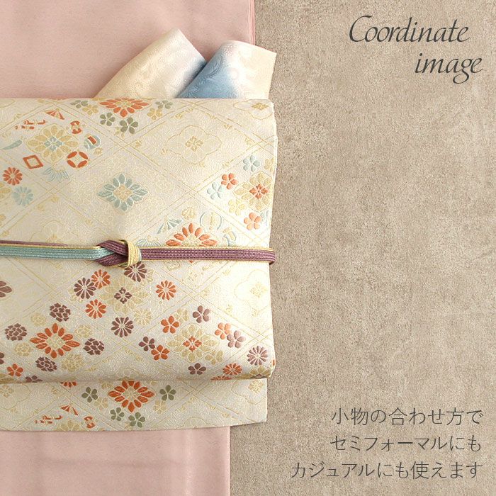 他の画像を見る 《お仕立て上り・送料込》【最短日お届け】お稽古や小紋・紬・色無地などカジュアルな着物に 名古屋帯 クリーム色 九寸 帯 花菱 西陣織 < 丸勇織物 > お仕立て上がり 6通柄 正絹 当店特別価格 ¥ 33,000 税込 カートに入れる お気に入りに登録する
