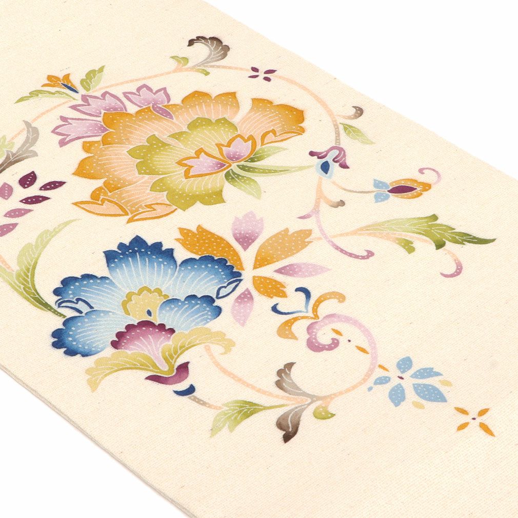 他の画像を見る 《お仕立て上り・送料込》【最短日お届け】お稽古や小紋・紬・色無地などカジュアルな着物に 名古屋帯 生成り 九寸 帯 <蔓唐花> 江戸紅型 紅型 東京染 当店特別価格 ¥ 77,000 税込 カートに入れる お気に入りに登録する