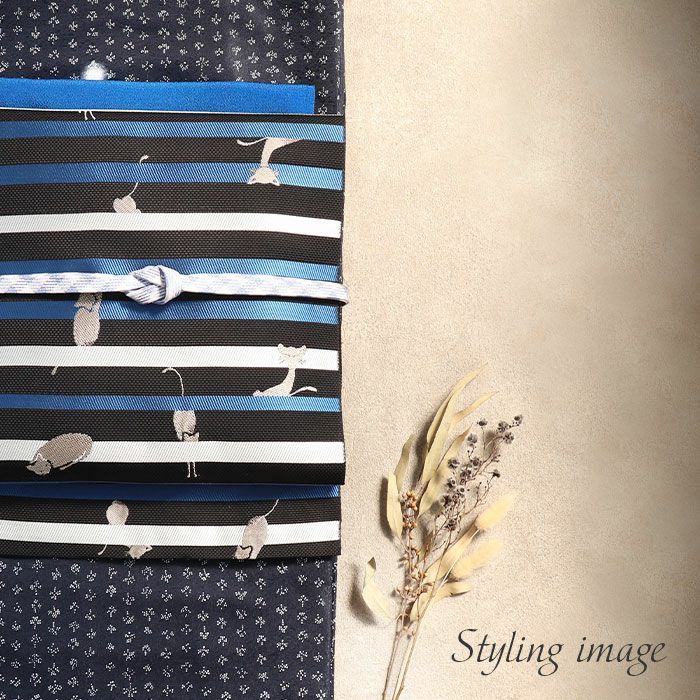 届いてすぐに使えるお仕立上りの本場筑前博多織の八寸名古屋帯です。 やんちゃな黒猫が可愛いらしいデザイン。 博多織ならではの正絹の光沢に、青と黒・白のボーダーがお出かけをさらに楽しくしてくれそう。 締め心地も気持ちがよく、「キュッ」とした絹鳴りが響くほど。締まりやすく緩まないのも博多帯ならではです。 小紋や紬、色無地、街着などのカジュアルきものに最適で、手軽にお洒落を楽しめます。 観劇、芸術鑑賞、ショッピング、ちょっとしたお出掛け等幅広くご活用くださいませ。