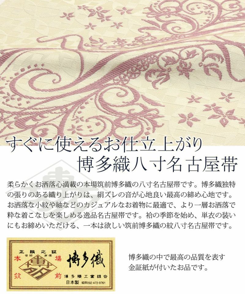 届いてすぐに使えるお仕立上りの博多織八寸名古屋帯です。 小紋や紬、色無地、街着などのカジュアルきものに最適で、手軽に楽しめる普段用帯です。 お太鼓は一重太鼓で、帯結びが苦手な方でも締めやすく、お稽古事にも最適な商品です。