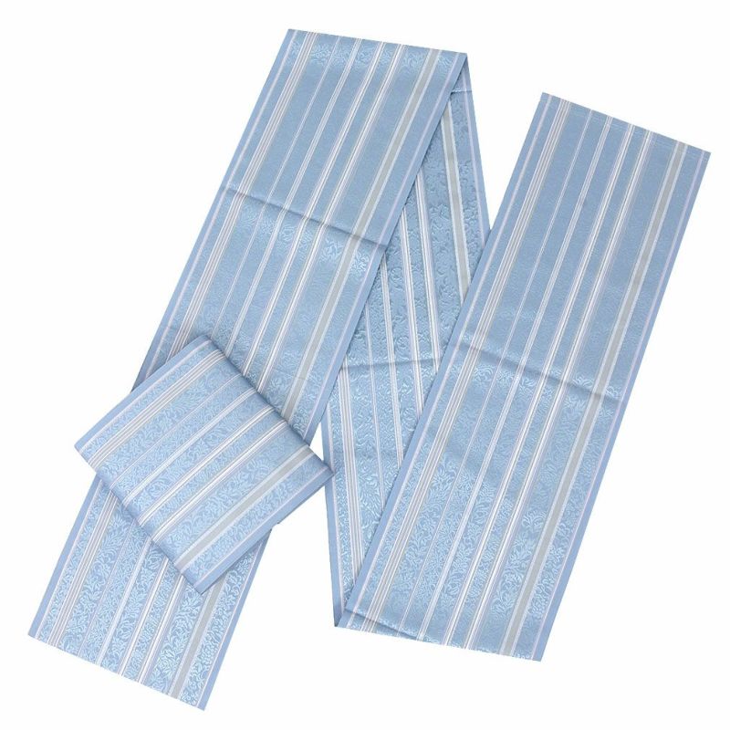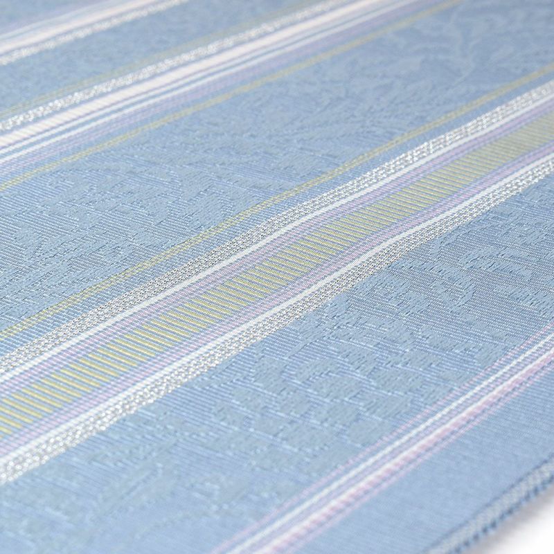 上品で優しく、独創的なもの作りを目指す黒木織物の八寸名古屋帯です。 縦に流れる縞の間に銀糸で細かく織り上げられた唐草模様は繊細でエレガント。 光の当たり具合で柄が浮かび上がり、大人の着こなしを上品に盛り上げてくれます。 濃い目の水色の帯地は、鮮やかすぎず品のある色合いが魅力的です。 「博多の織人・おりびと」に由来するブランドネームは、博多織の源流ともいうべき織物を主体としながらも、常に「独創的」なものづくりを目指す姿勢を表しました。 博多織の中でも最高級の「金印」のお品です。 博多織独特の絹鳴りと正絹ならではの柔らかな光沢もつ帯は、ワンランク上の着姿を演出します。 観劇、芸術鑑賞、ショッピング、ちょっとしたお出掛け等幅広くご活用いただけます。 見る人を楽しませる魅力的な帯は、粋な着姿を演出します。 日常のお洒落に本場筑前博多織の帯をご堪能下さい。