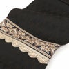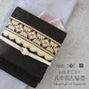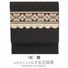 届いて直ぐに使えるお仕立て上がりの八寸名古屋帯です。 本場筑前博多織は、その締め心地のよさから多くのきもの愛好家に好まれているお品です。 本商品はキステオリジナルデザインで、独創的な柄付けと細やかな織りが自慢のワンランク上の作品です。 シックな黒の帯地には、落ち着きある茶色でアールデコ調の幾何学模様を細かく丁寧に織り上げてもらいました。目立ちすぎず、控えめ過ぎない絶妙なサイズの織柄は光の当たり具合で柄が浮かび上がり、大人の着こなしを上品に盛り上げてくれます。 お太鼓部分には、繊細な菱型模様やリーフ模様などの刺繍が施されたインド刺繍リボンをチョイス。所々に煌めくスパンコールも控えめながらとても印象的に光ります。 やや直線的でクールな雰囲気がメインだったデザインに、シャンパンゴールドの立体感のあるレースをあしらうことで柔らかさもプラス。かっこよさを持ちつつ、他にはない大人可愛いデザインに仕上がりました。 絹糸100%で織り上げているため、通気性や吸湿性に優れ、季節を問わずお使いいただけます。 本商品は開き仕立てになりますので、ご利用される方の身長や体格で前腹の幅を調整して頂ければ、よりバランス良くご着用して頂けます。 博多織独特の絹鳴りと正絹ならではの柔らかな光沢をもつ帯は、人と差がつく着姿を演出します。 観劇、芸術鑑賞、ショッピング、ちょっとしたお出掛け等幅広くご活用いただけます。 日常のお洒落に本場筑前博多織の帯をご堪能下さい。