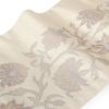届いてすぐに使える、お仕立て上がりの九寸名古屋帯です。 京都西陣で織り上げられた、西陣証紙のついた確かな品質。 ベージュの地には、唐花の模様が繊細かつ大胆に織り込まれており、金糸が煌めくデザインが特徴です。 上品な帯ですのでコーディネートしやすく、 小紋や紬、色無地、御召などの着物に最適です。 帯は伝統工芸の西陣織にて仕立てられており、染められた糸を複雑に織って模様を作るので、完成までに多数の工程があり、とても手間暇がかかる高級絹織物です。 こうして丁寧に織られた生地は、先染めしてから織っているので、一般的な染色法の後染めより丈夫でシワになりにくいのが特徴です。 絹の帯は光の当たり方で絹特有の柔らかな光沢が反射し、高級感あふれる美しい帯の質感がお楽しみいただけます。 しなやかな手触りと締め心地の良さを兼ね備え、正絹特有の柔らかな光沢をもつ逸品です。 仕立てはお太鼓結びのしやすい名古屋仕立て。胴前がすでに半分に折られた状態ですので、帯結びが苦手な方でも締めやすく、お稽古事にも最適な帯です。 西陣織の意匠こもった深みのある柄行きが、後ろ姿のお太鼓も胴前も凛とした着姿を演出してくれるでしょう。 ぜひご自身の着物コーディネートに取り入れていただきたい名古屋帯です。