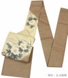 琉球の芭蕉布の風合いを絹糸で表現した、絹芭蕉の手描き友禅九寸名古屋帯です。 透け感とシャリ感を併せ持つ夏らしい涼やかな風合いで、お洒落感と上品さがある逸品。 茶系をベースに白い椿やススキなどが描かれた、夏の小紋や紬などに最適な一本です。 個性的な着こなしを楽しめるお洒落な商品で、お食事会やちょっとしたお出掛けなどに気軽にお締めいただける、夏用の九寸名古屋帯です。 絹芭蕉は玉繭(2匹で同時に1粒の繭を作るため、2本の糸が絡まりながら節のある糸ができる)からとった生糸や桂糸(繭から糸を引き出す際に初めてでてくる糸で、太さが不揃いで節がある)を用いて製織されております。 また素材にシャリ感をもたせる為、あえて精錬(生糸の不純物を取り除く)がされておりません。 よって、繭から取り出したままの生糸を使用されておりますので、太さも不揃いで節がありますが、帯の風合いとしてご理解をいただけますようお願い致します。